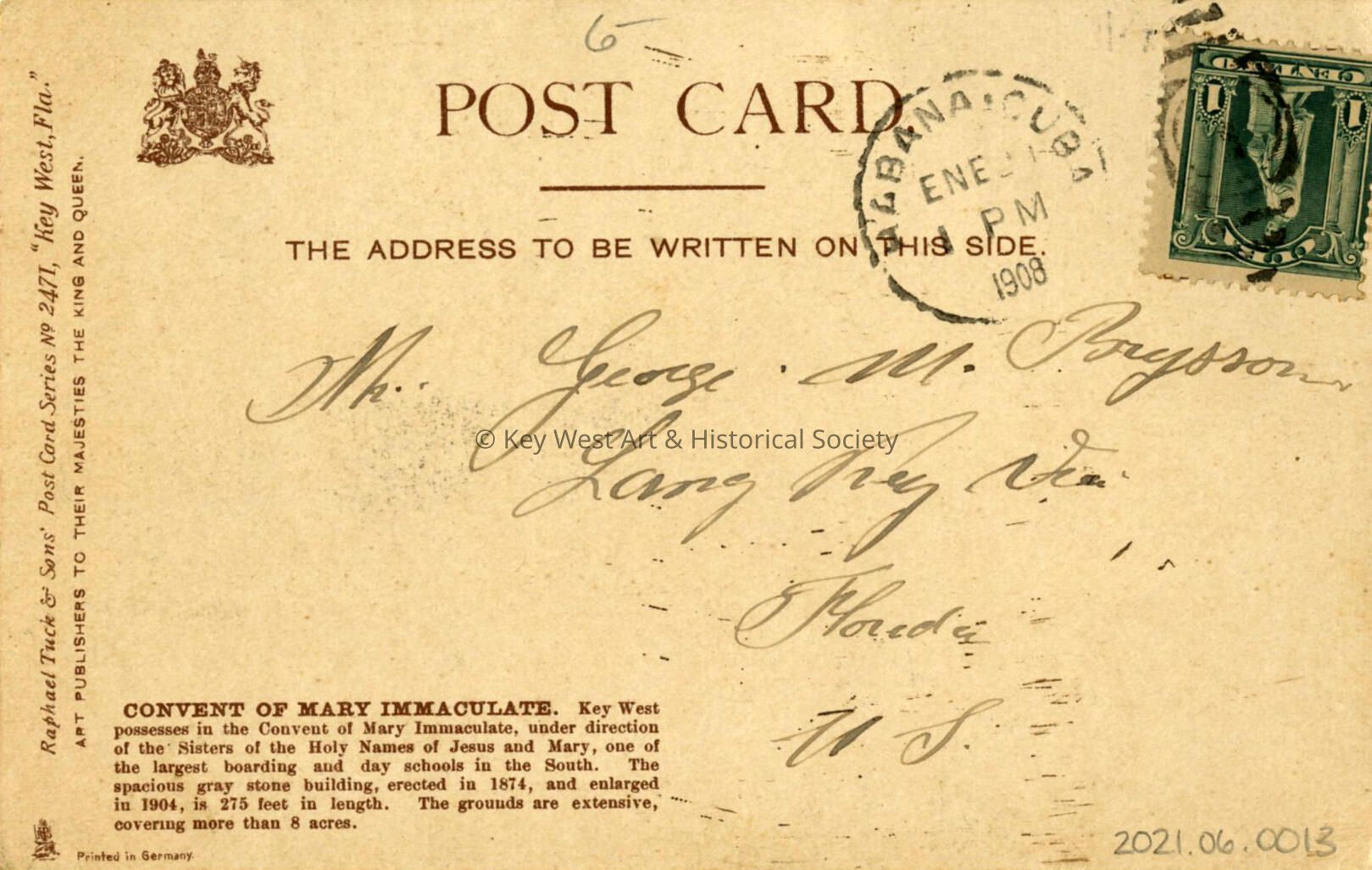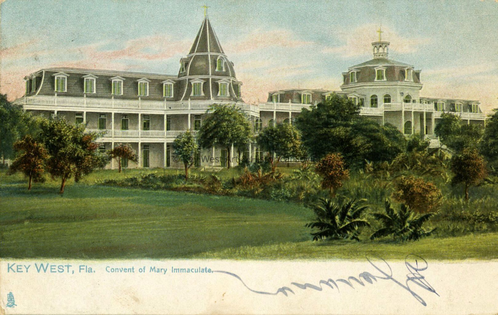 Postcard depicting the Convent of Mary Immaculate on Truman Avenue. The caption reads, ‘Key West, Florida, Convent of Mary Immaculate’. The notation on verso, ‘Convent of Mary Immaculate. Key West possesses in the Convent of Mary Immaculate, under direction of the Sisters of the Holy Names of Jesus and Mary, one of the largest boarding and day schools in the South. The spacious gray stone building, erected in 1874, and enlarged in 1904, is 275 feet in length. The grounds are extensive, covering more than 8 acres.'Subject Place