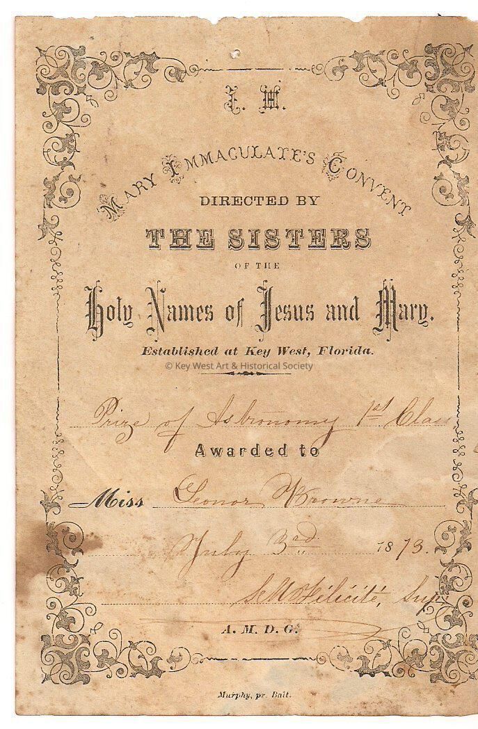 'Mary Immaculate's Convent Directed by The Sisters of the Holy Names of Jesus and Mary. Established at Key West, Florida. Prize of Astronomy 1st Awarded to Miss Leonor Browne,' older sister of Jefferson B. Browne. July 3, 1873.Collection