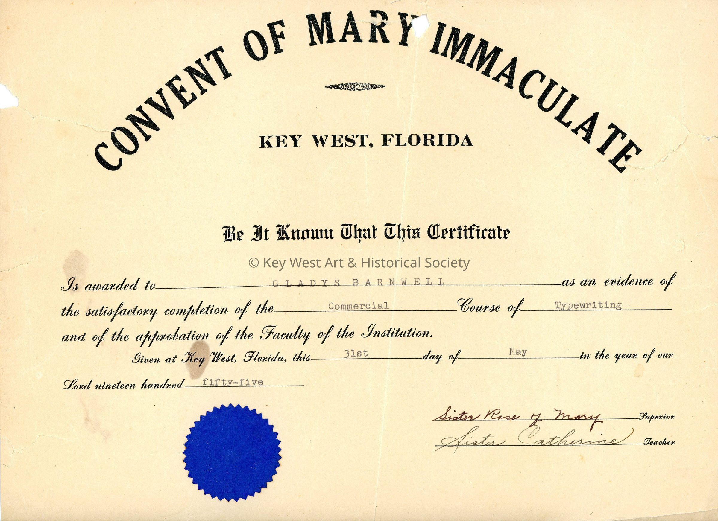 Unframed paper diploma from the Convent of Mary Immaculate belonging to Gladys Marie Tomandl (nee Barnwell) signifying the completion of a typewriting course in 1955.Collection
