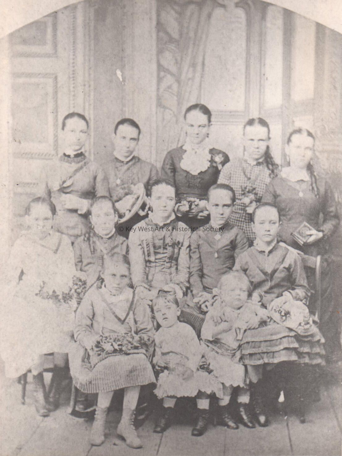 Convent of Mary Immaculate in Key West, 1883 class - 1st row - Pauline Becaisse, Annie O'Brien Reedy, and Isabel Duffy. 2nd row - Nellie Smith Johnson, Myrtle Messina Lester, Maggie Galagher McDermott, Kate O'Brien, and Maurie Duffy. 3rd row - Ignatius Delona Brost, Carrie Messina, Mollie O'Brien, Agnes Wade, and Lizzie Fogarty.Collection