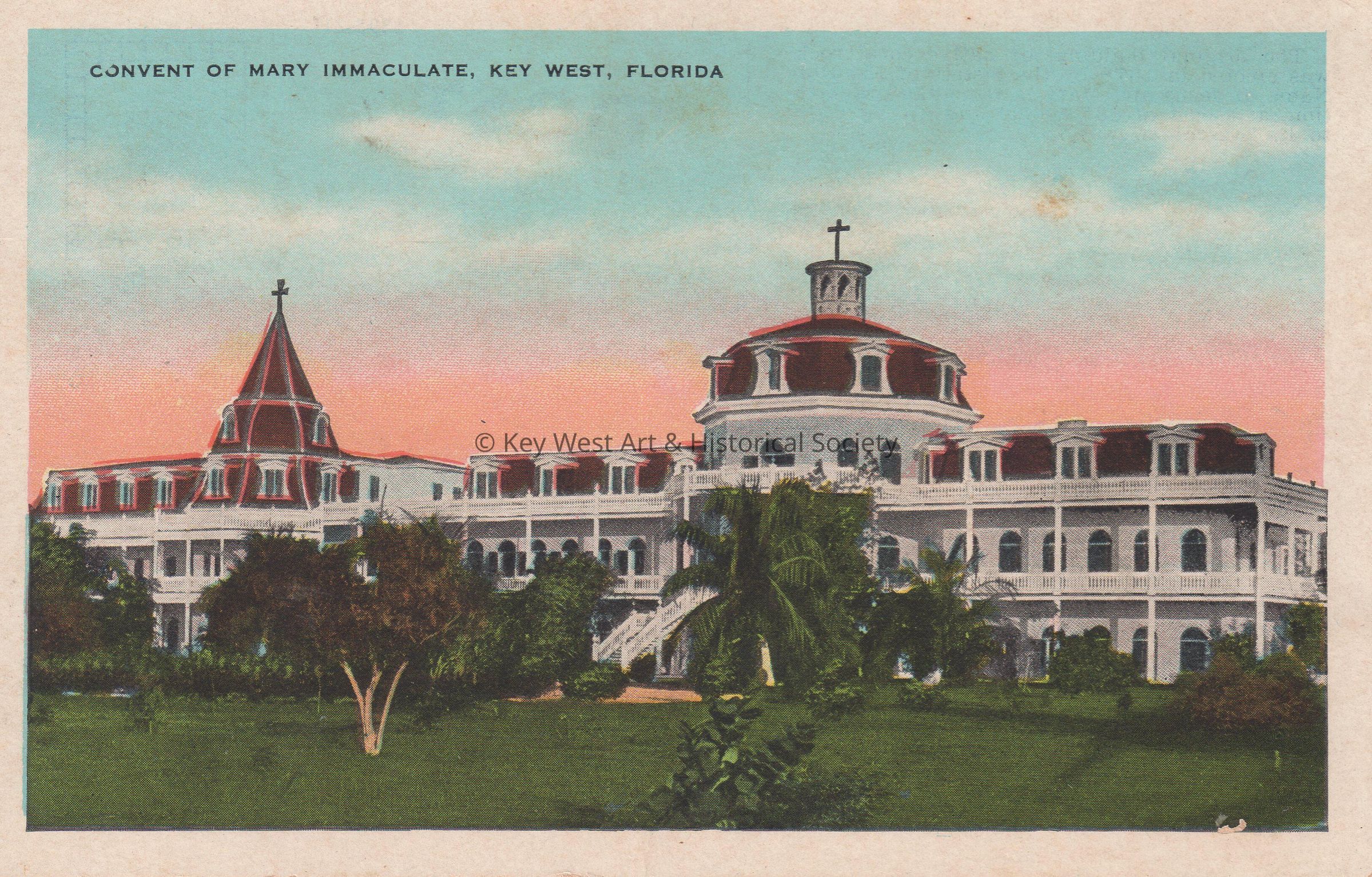 Postcard depicting the convent. The caption reads, ‘Convent of Mary Immaculate, Key West, Florida.’ The description on the verso reads, ‘The original building of native coral rock, was erected in 1878 by the Sisters of the Holy Name of Jesus and Mary, a Canadian organization, at a cost of $35,000.00 and was enlarged to its present size in 1904.’Collection