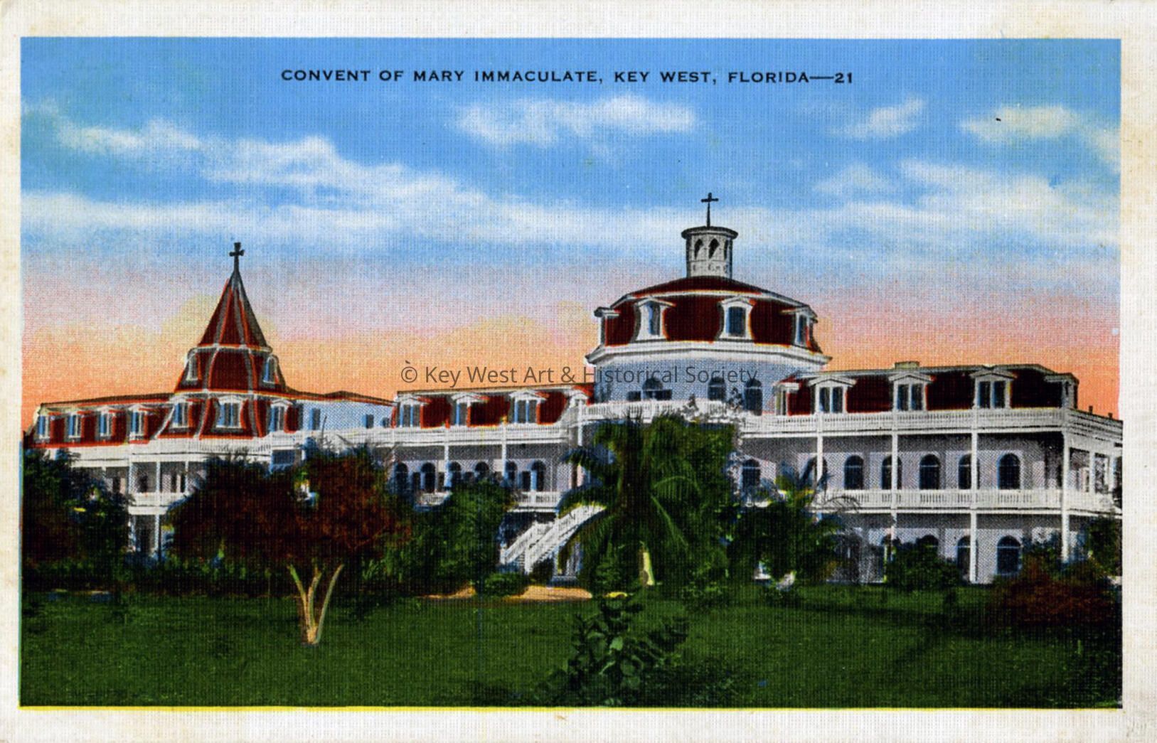 Postcard depicting the Convent of Mary Immaculate that formerly stood on Truman Avenue (Division Street). The caption reads, ‘Convent of Mary Immaculate, Key West, Florida.’ Notation on verso, The original building of native coral rock, was erected in 1878 by the Sisters of the Holy Name of Jesus and Mary, a Canadian organization, at a cost of $35,000.00 and was enlarged to its present site in 1904.'Subject Place