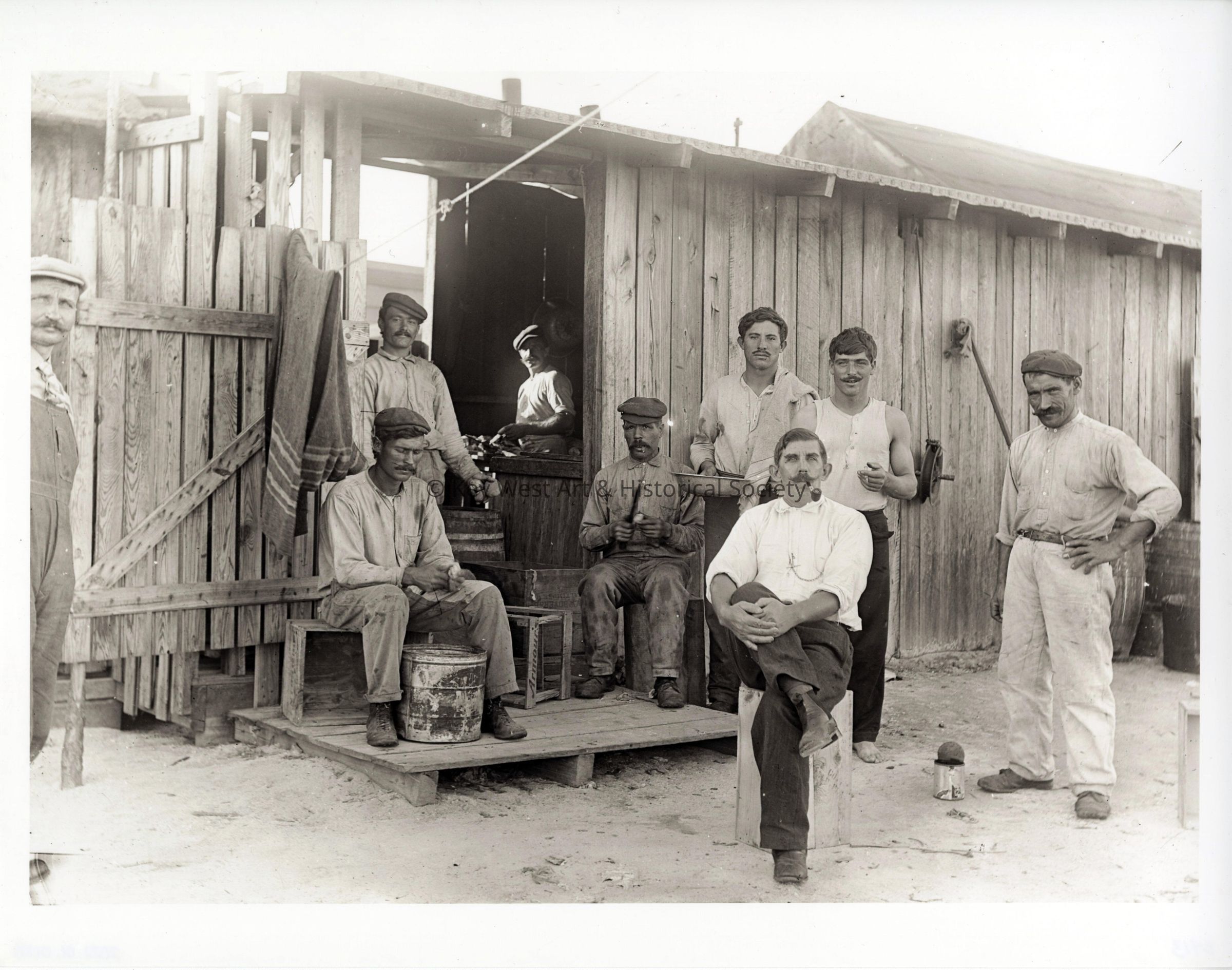 Black and white print taken from a dry plate glass negative of cooks peeling potatoes at the Pigeon Key railroad camp. The image was taken during the construction of Seven Mile Bridge on the Overseas Railway.