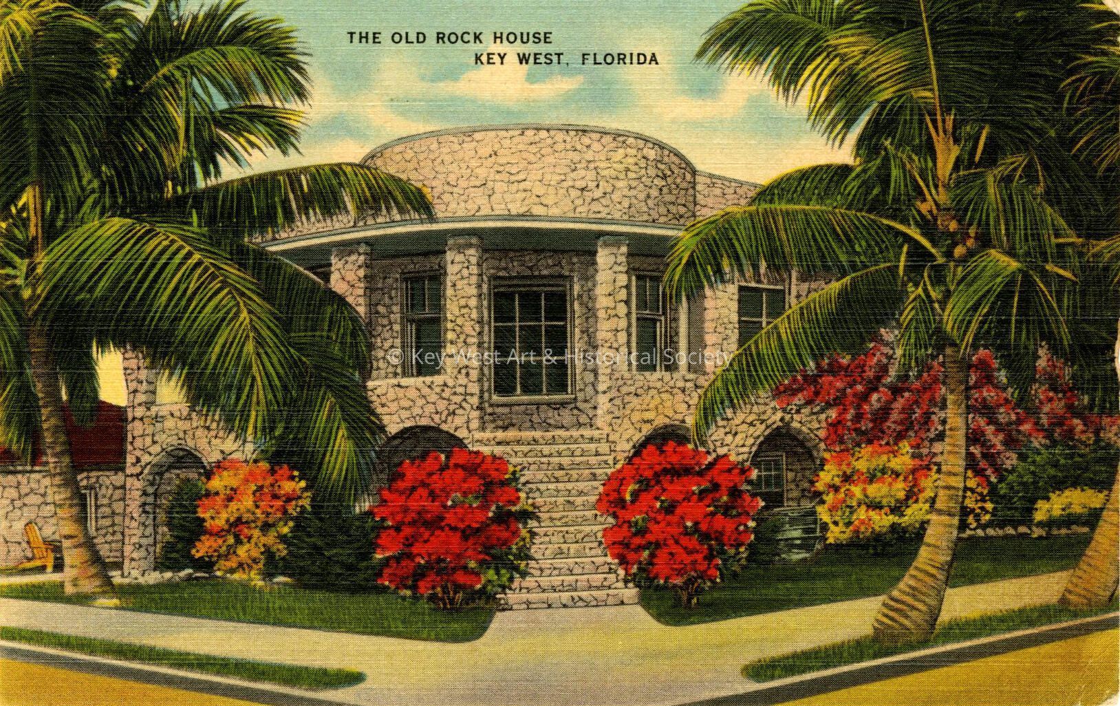 Linen postcard depicting the coral rock house located at 1401 Reynolds Street. The caption reads, ‘The Old Rock House, Key West, Florida'. The description on the verso reads, 'This house is entirely made of Coral Rock and is the oldest of its type in Key West.'Subject Place