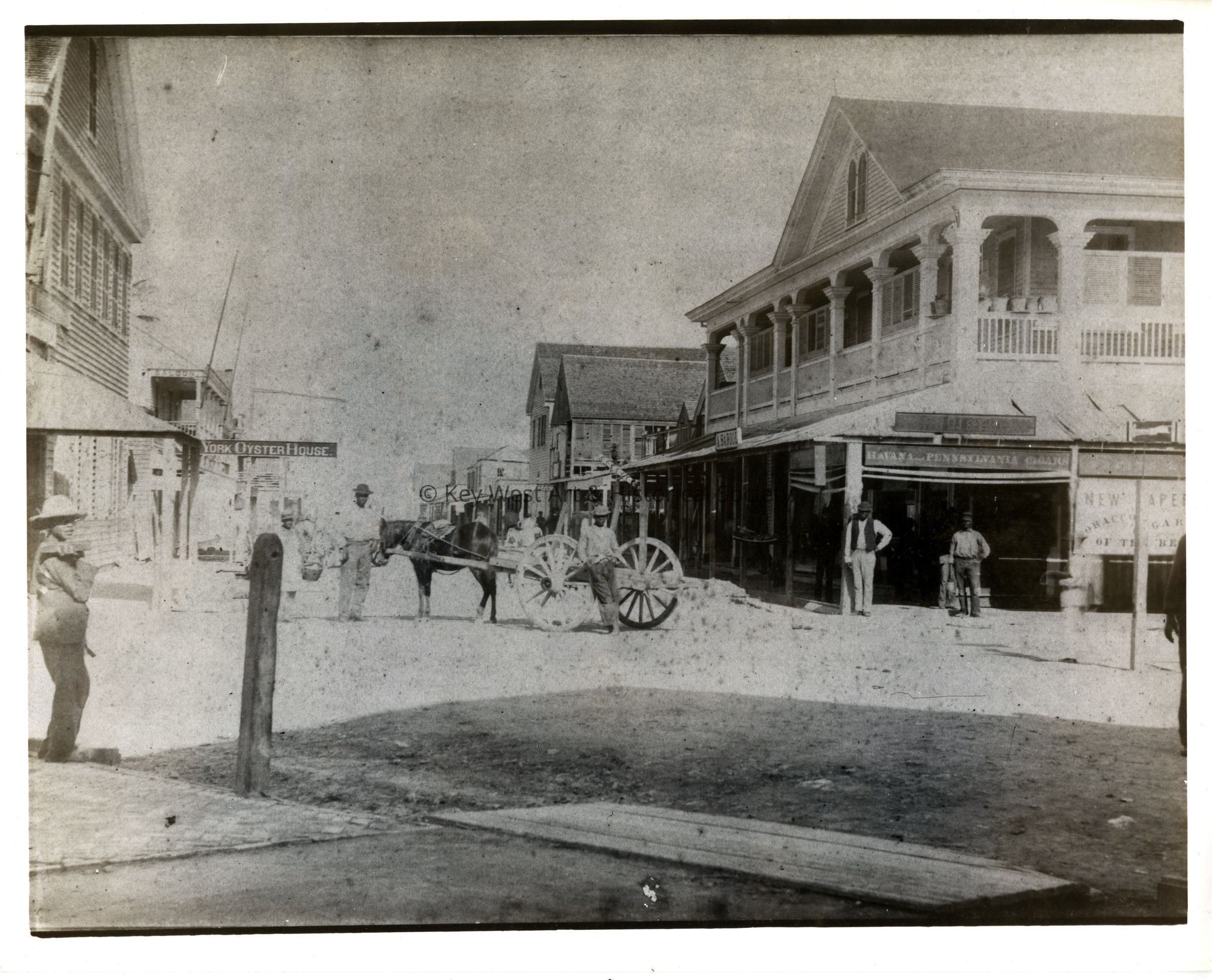 Black and white photograph of the Havana and Pennsylvania Cigar Company building on the corner of Duval and Front streets. The view is looking northeast down Front Street toward Key West Bight. The A. Sariol Store is visible on the right while the New York Oyster House is on the left.