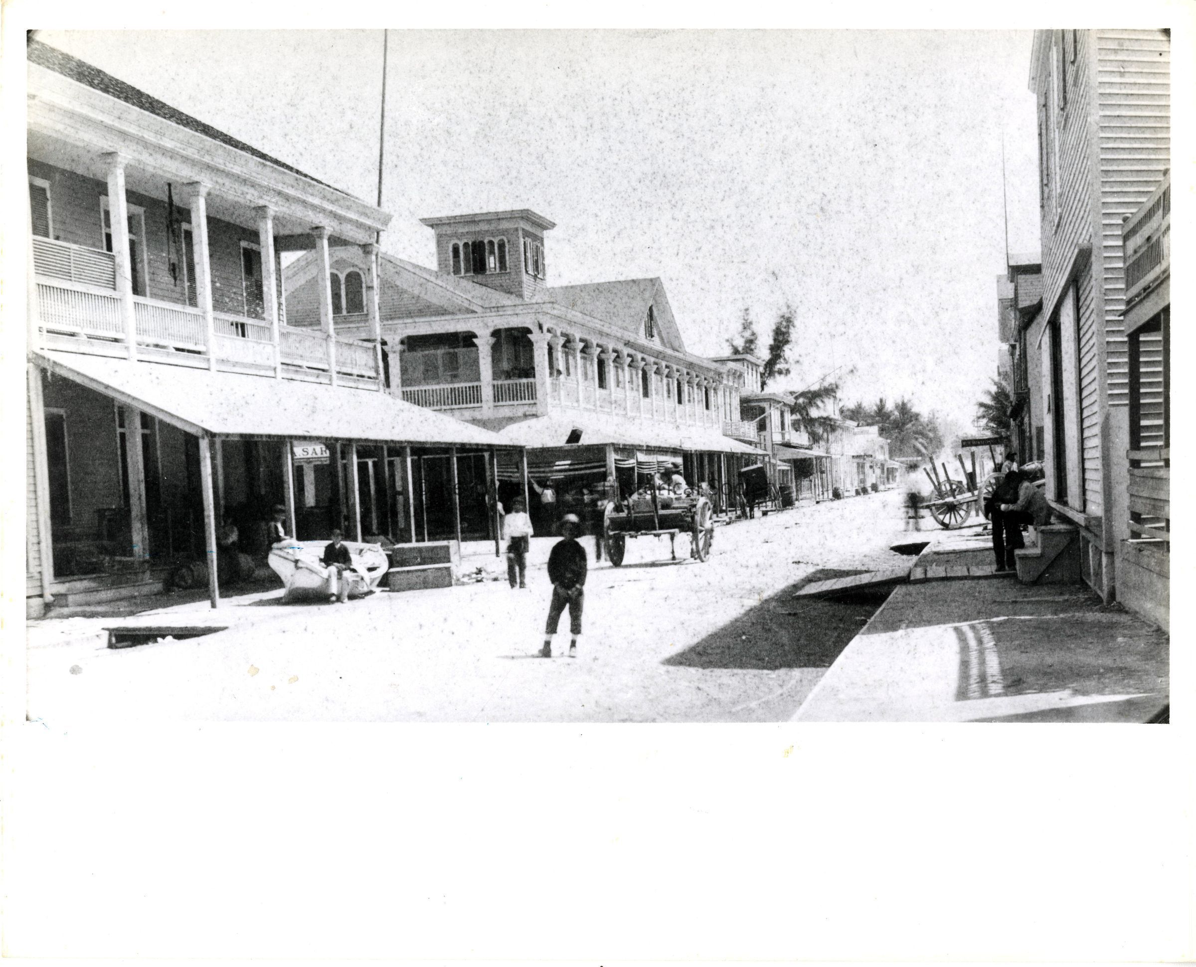 Black and white photograph of the corner of Duval and Front streets, looking south down Duval Street.