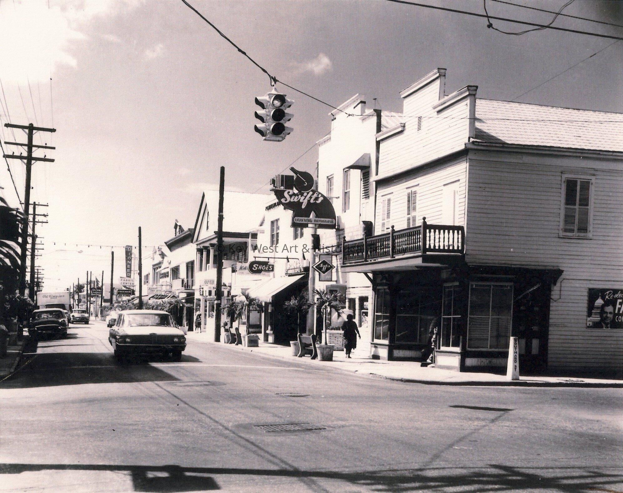 Digital copy of a black and white photo showing the corner of Southard and Duval. Photo taken in the 1970's. Photo is part of a 'Then and Now' series. Modern photo #2671.