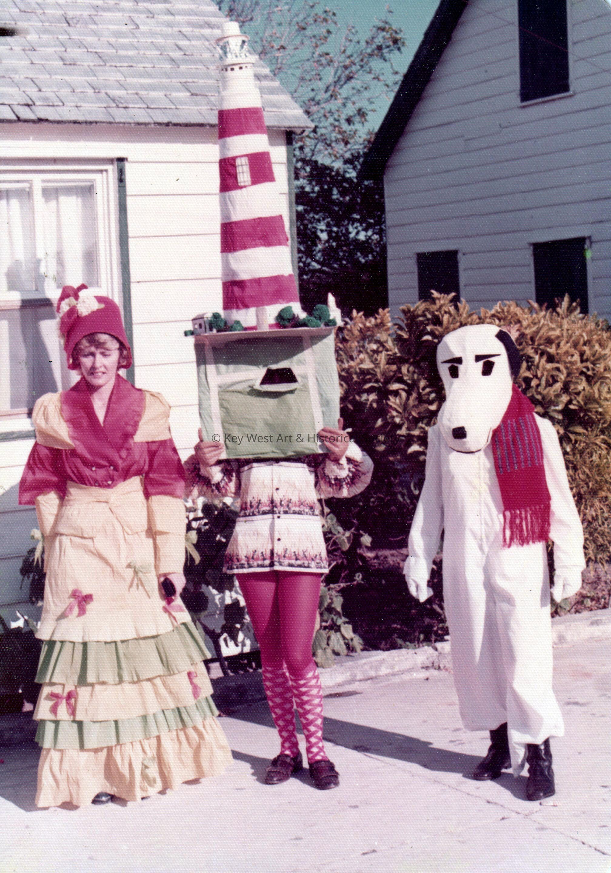 Color photograph of three unknown wearing costumes, possibly in Green Turtle Cay. One is dressed as the Hope Town Lighthouse while another is Snoopy.