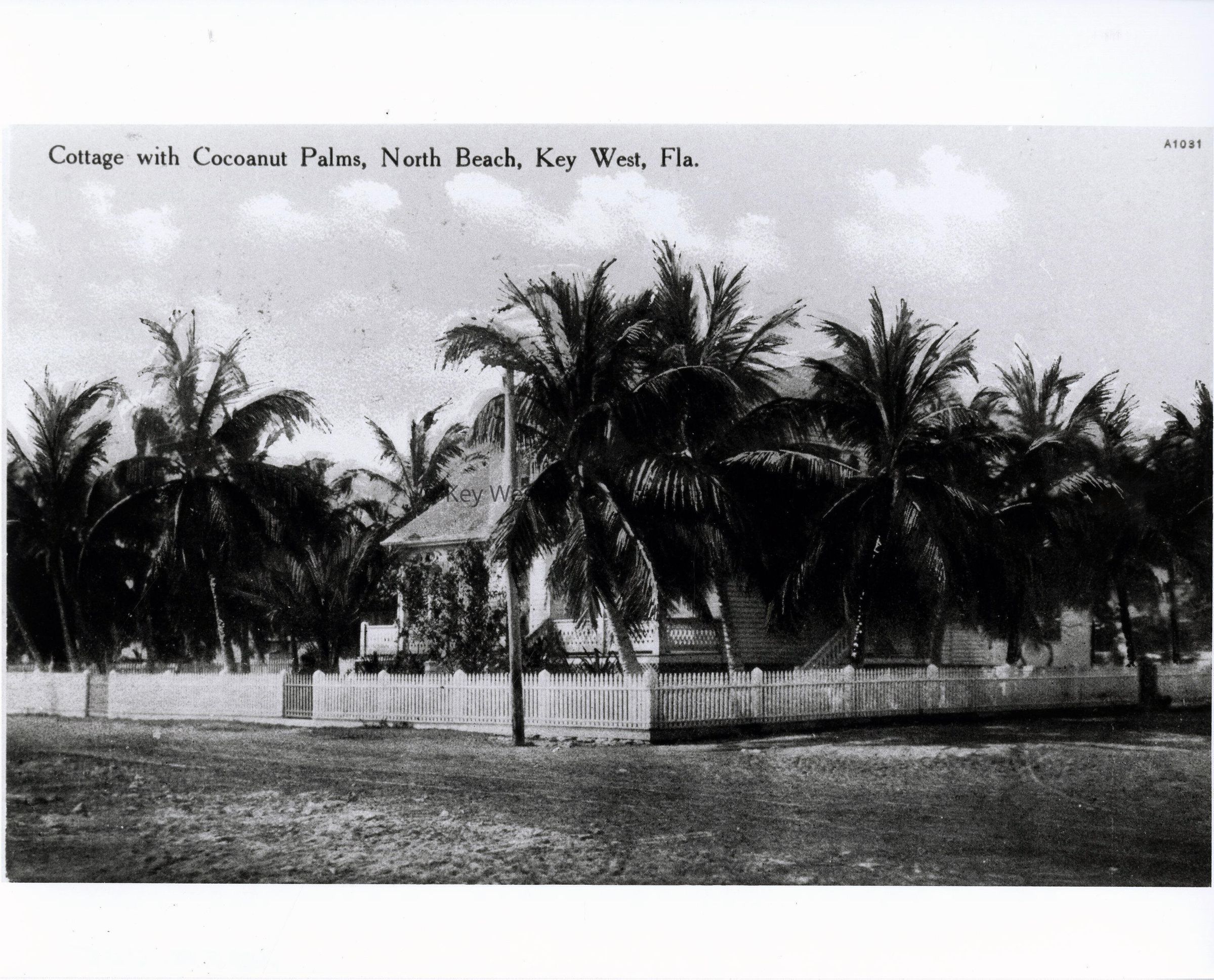 Black and white photograph of a postcard showing a house on present-day Eisenhower Drive. Notation reads, 'Cottage With Cocoanut Palms, North Beach, Key West, Fla.'Photograph Details