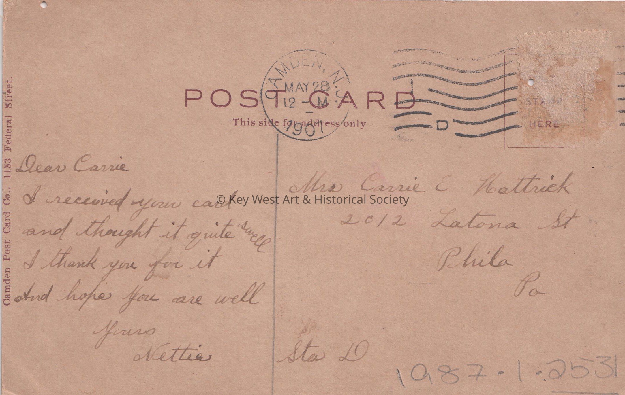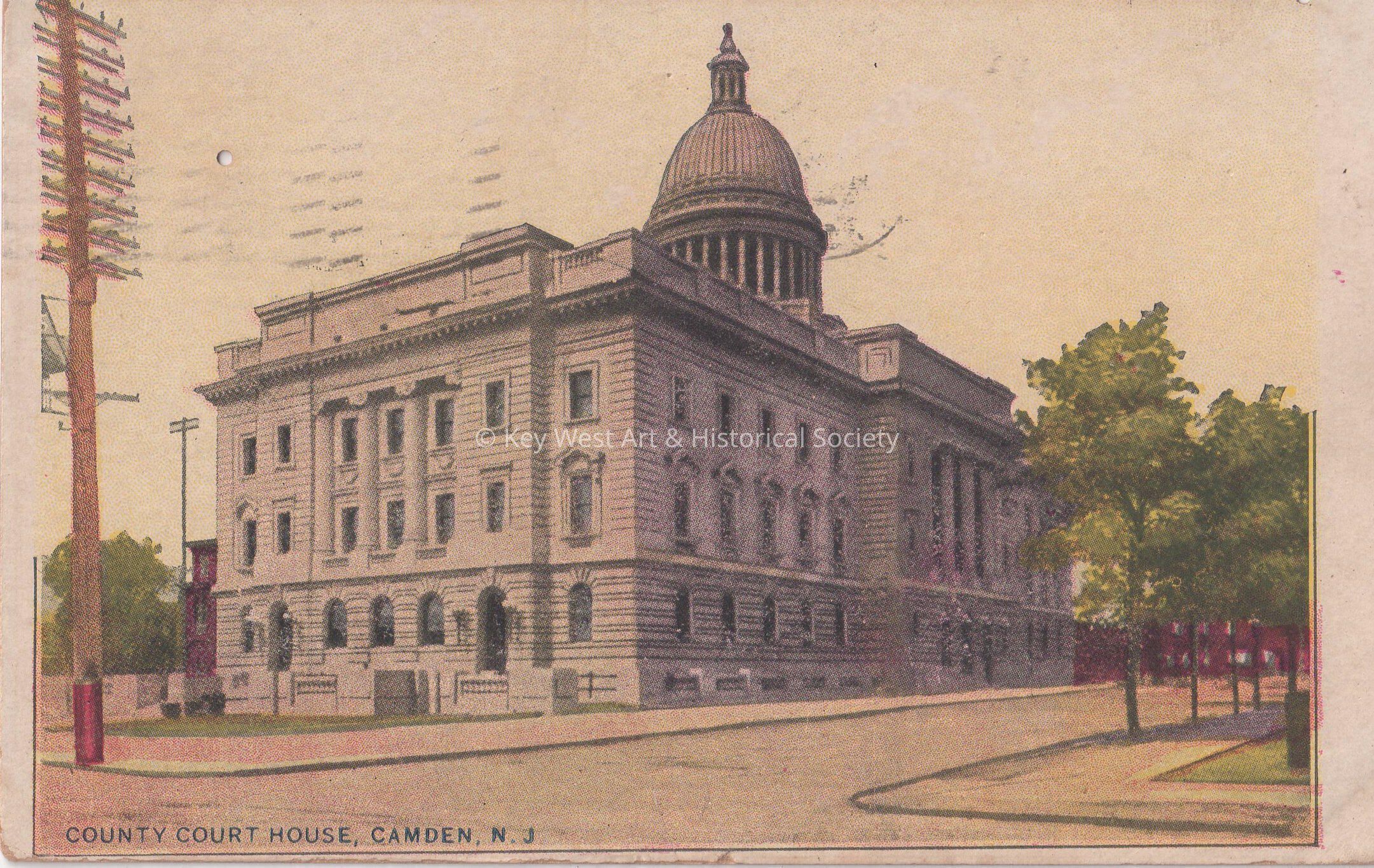 Postcard depicting a domed building. The caption reads, ‘County Court House, Camden, New Jersey.’ The message on the verso reads, ‘Dear Carrie, I received your card and thought it quite swell. I thank you for it and hope you are well. Yours, Nettie’. The card is addressed to Mrs. Carrie Hattrick, 2012 Latona Street, Philadelphia, Pennsylvania, Station D, and is postmarked Camden, New Jersey, May 28, 1907.Subject Place