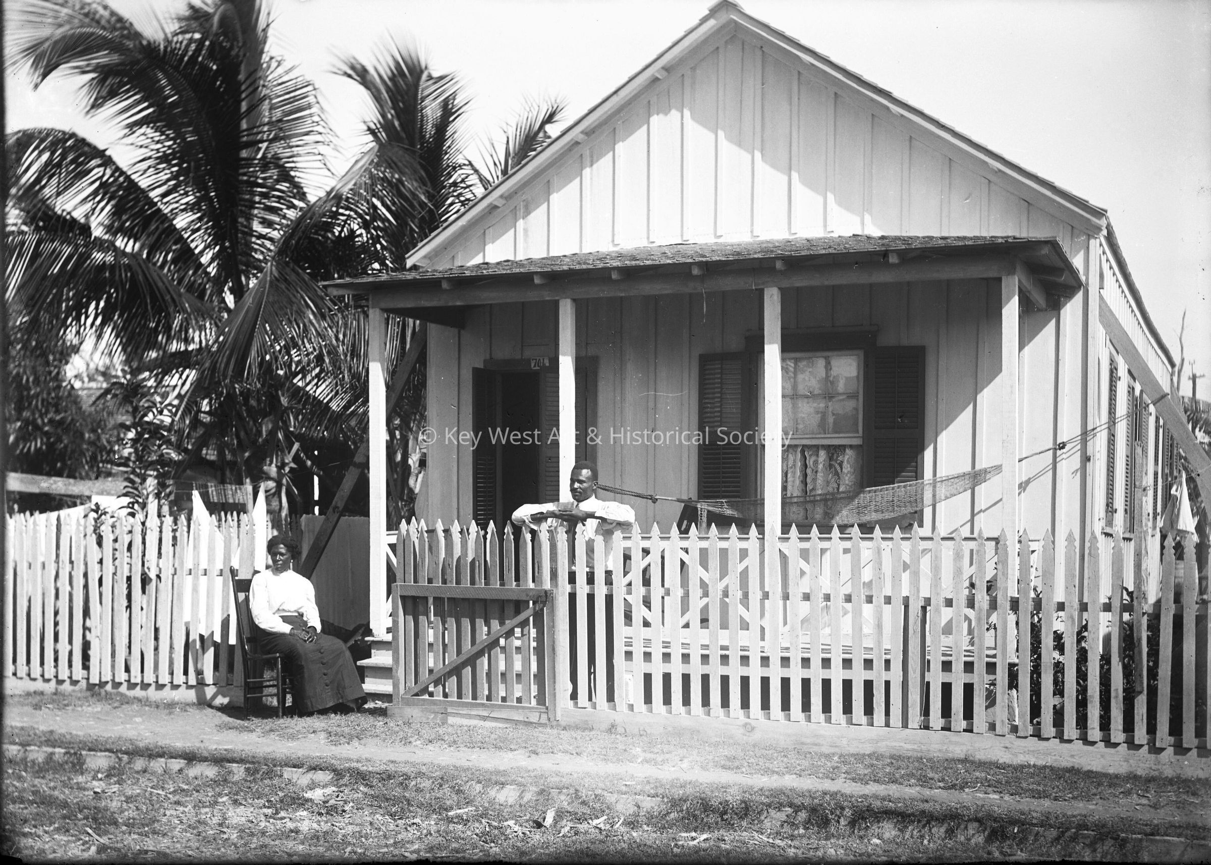 Black and white dry plate glass negative of a couple posing in front of their Key West house. Unknown where the house is, but it is numbered 706.