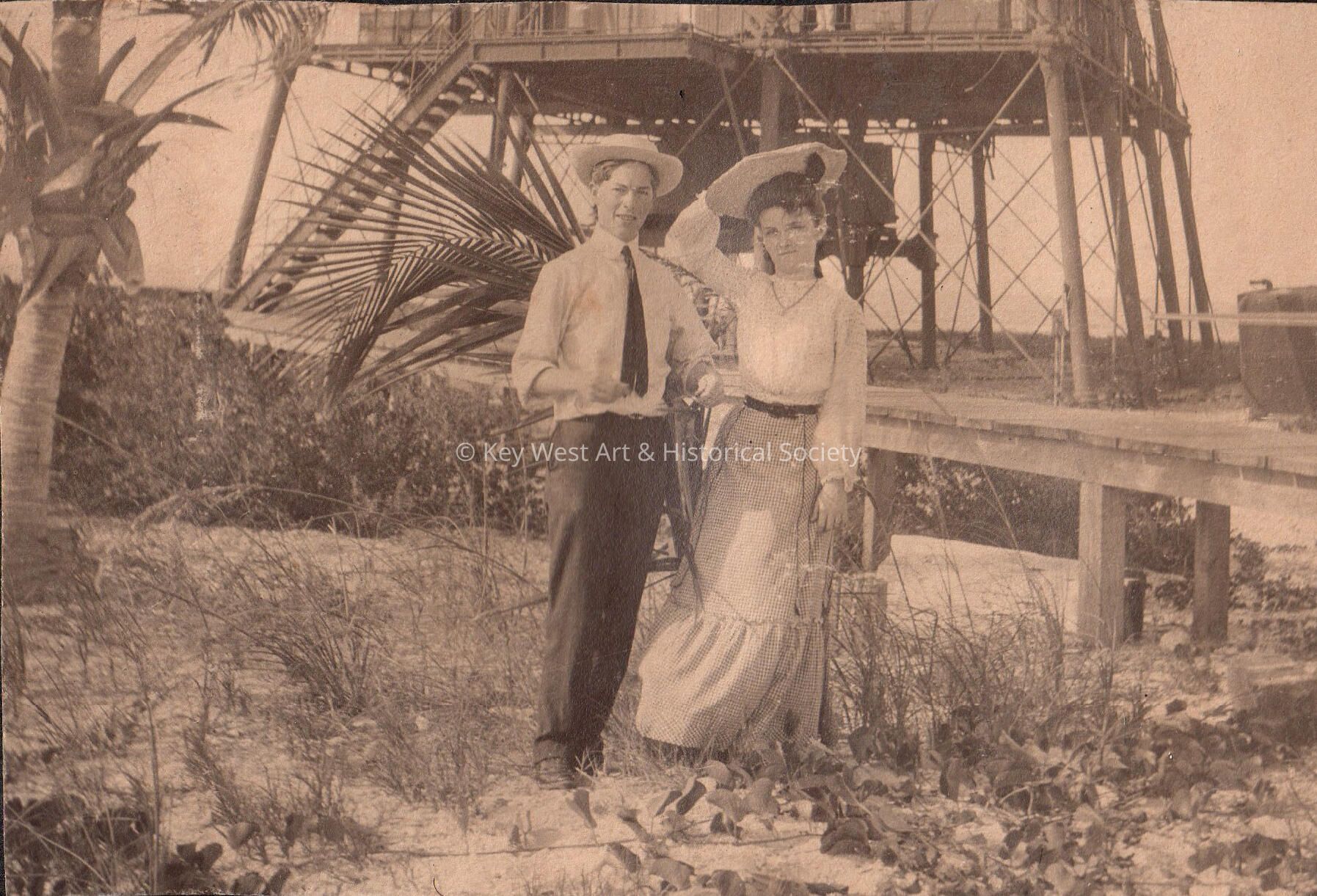 Black and white photograph of an unknown couple underneath Sand Key Lighthouse.