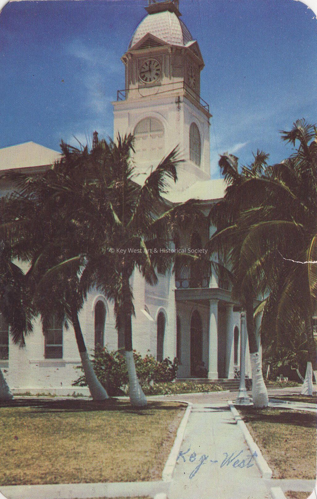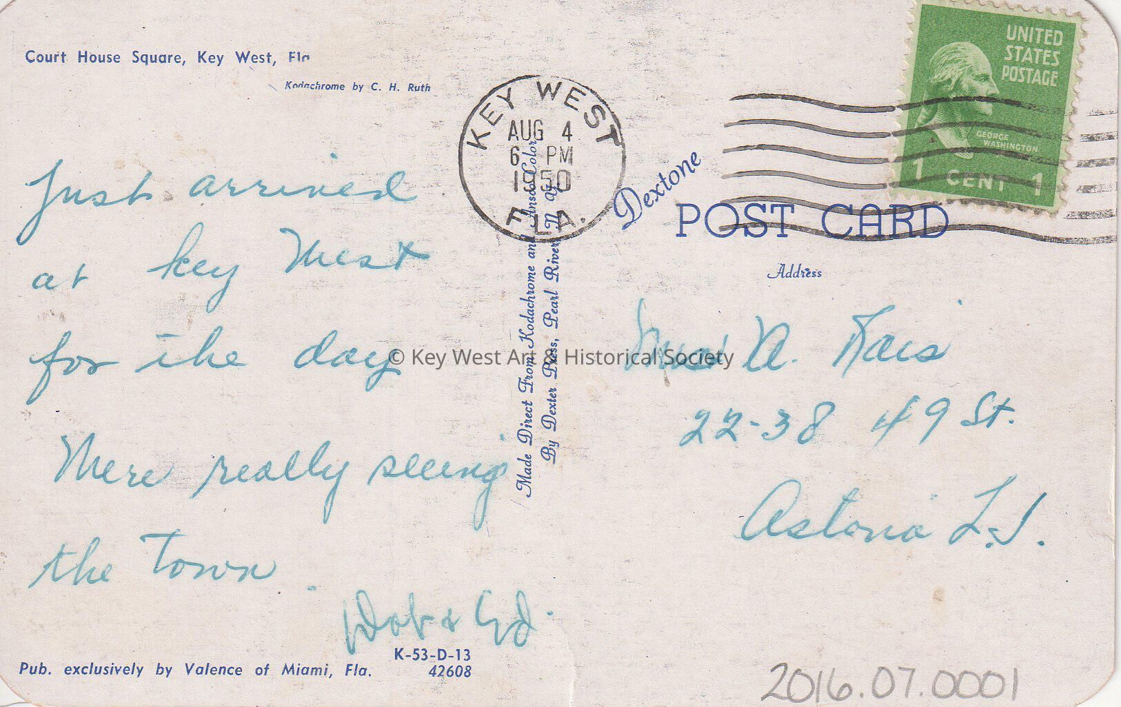 Postcard depicting a large building with a clock tower near palm trees. The description on the verso reads, ‘Court House Square Key West, Florida.’ The message on the verso reads, 'Just arrived at Key West for the day. We're really seeing the town. Dot and Ed'. The card is addressed to Mrs. A. Rais, 2238 49th Street, Astoria, Long Island, and is postmarked Key West, August 4, 1950.Subject Place