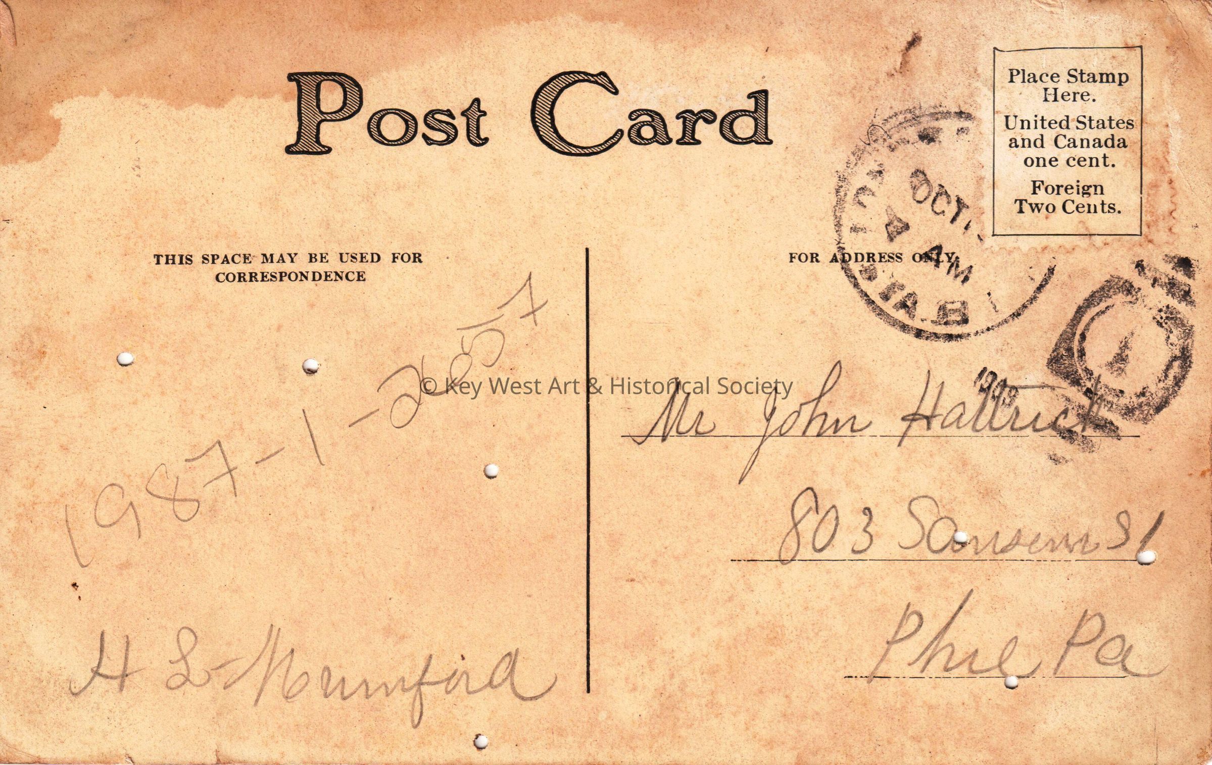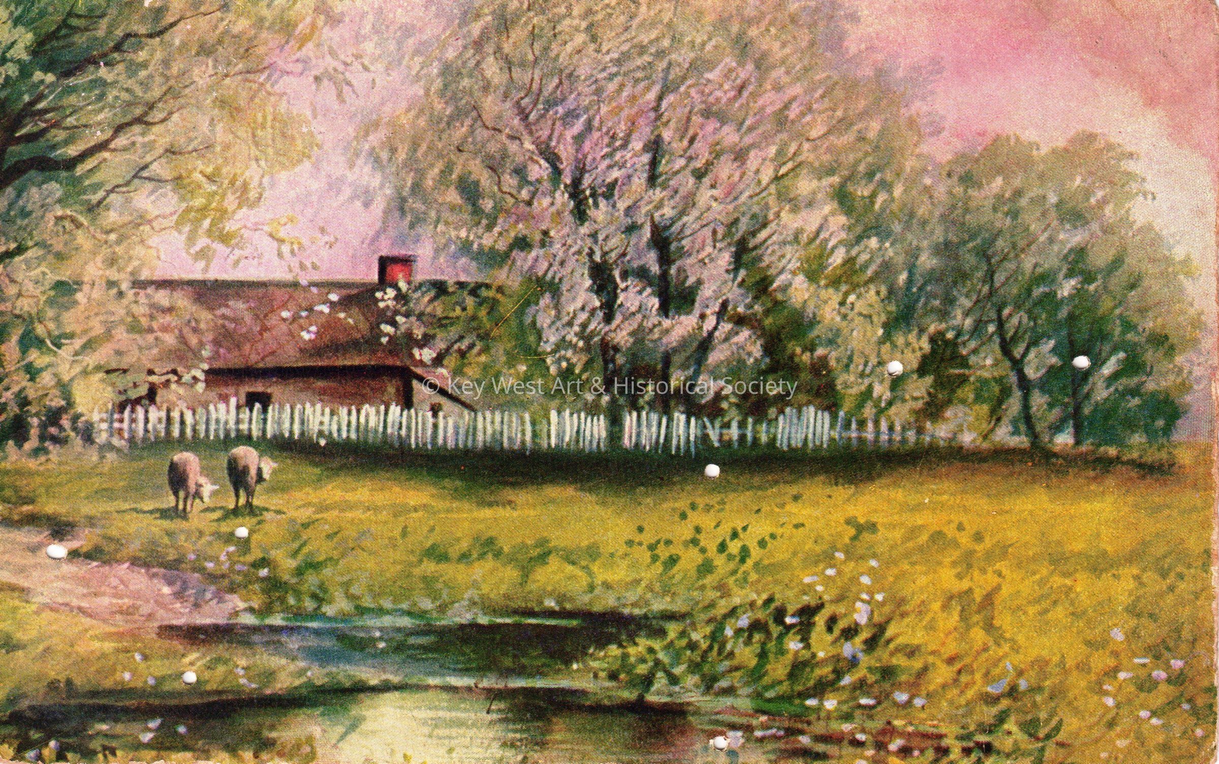 Postcard depicting a painting of cows in a field near a stream and trees. The message on the verso reads, ‘H.L. Hunford’. The card is addressed to Mr. John Hattrick, 803 Sansom Street, Philadelphia, Pennsylvania, and is postmarked October, 1909.Collection