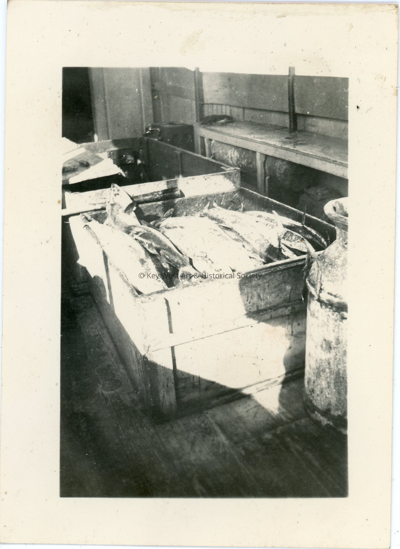 Black and white photograph of a crate of fish. The photo was part of a photograph album began by Victor H. Baker in 1940.