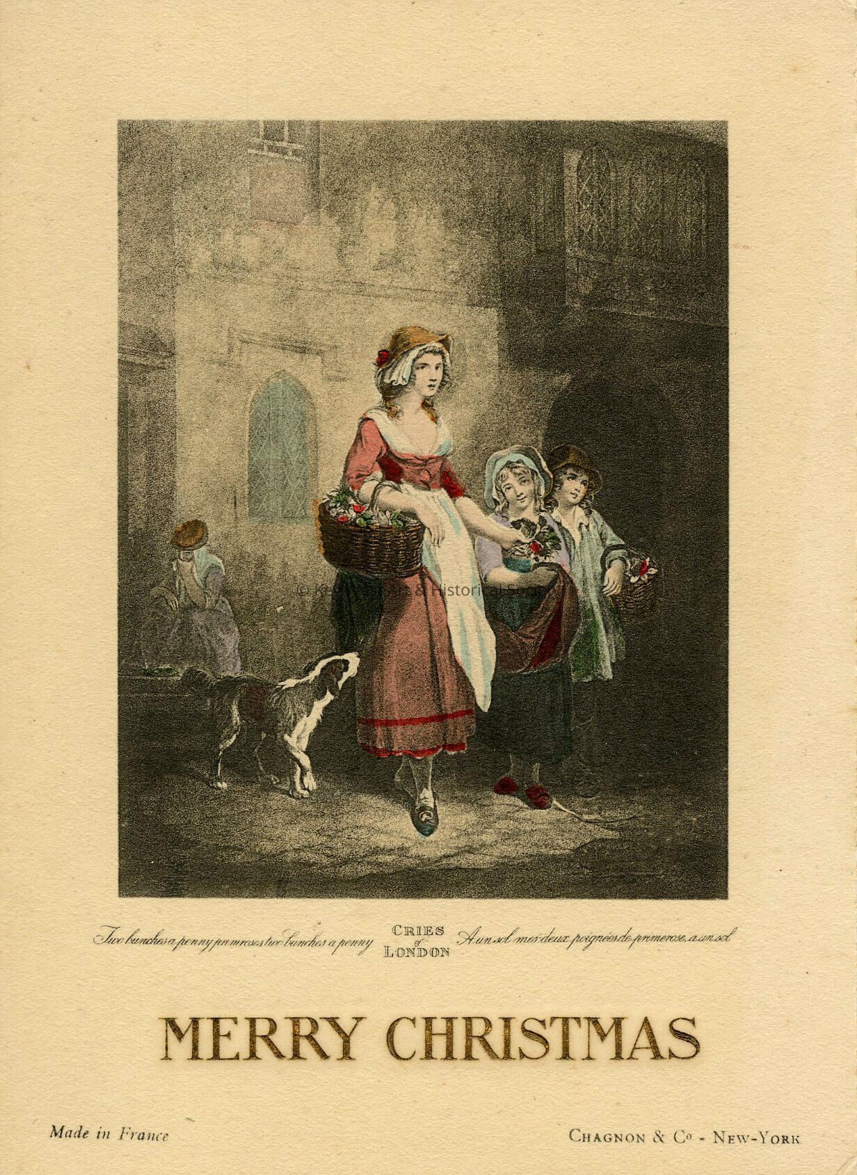 Hand-colored engraving from the 'Cries of London' series that was produced as a Christmas greeting.