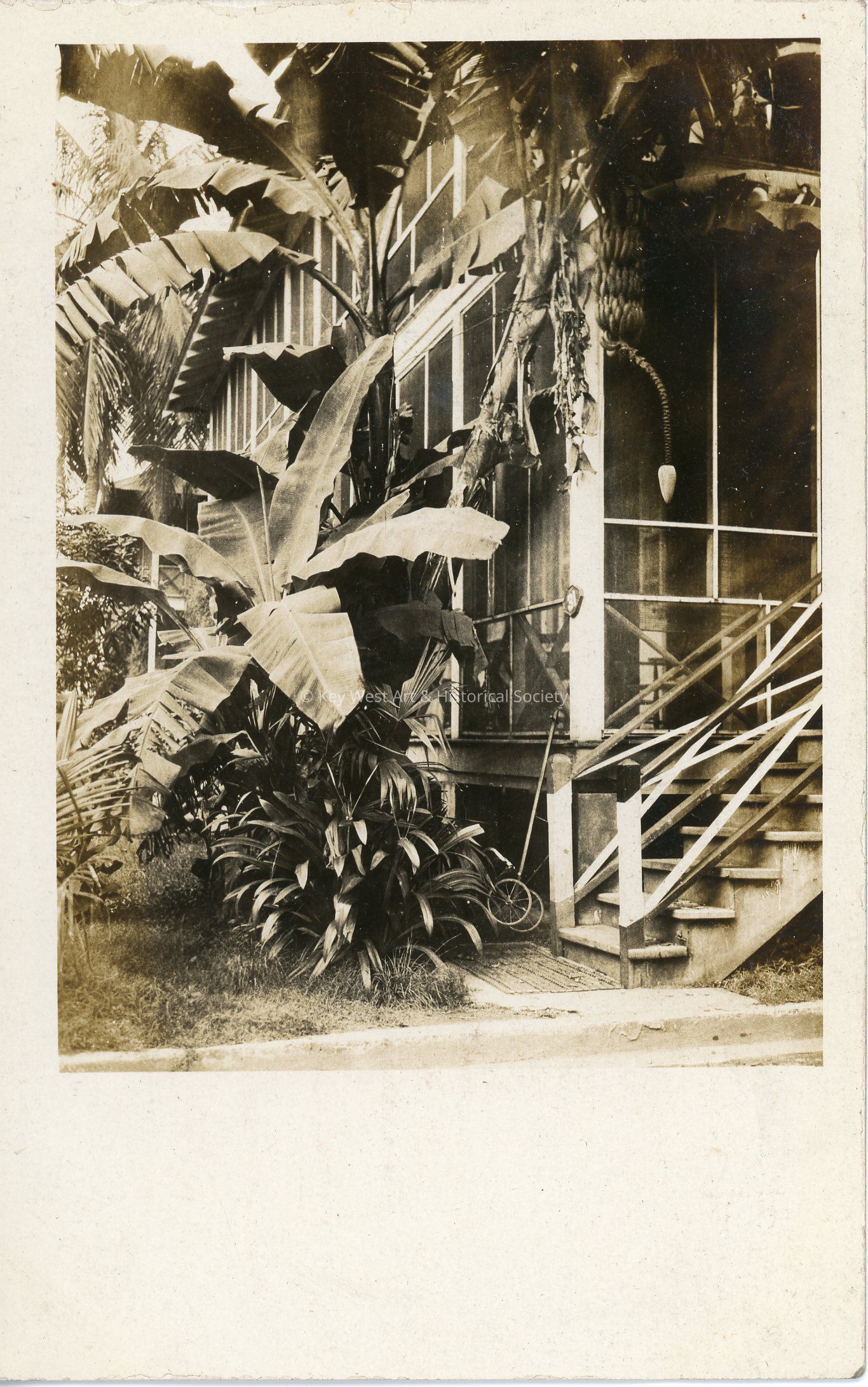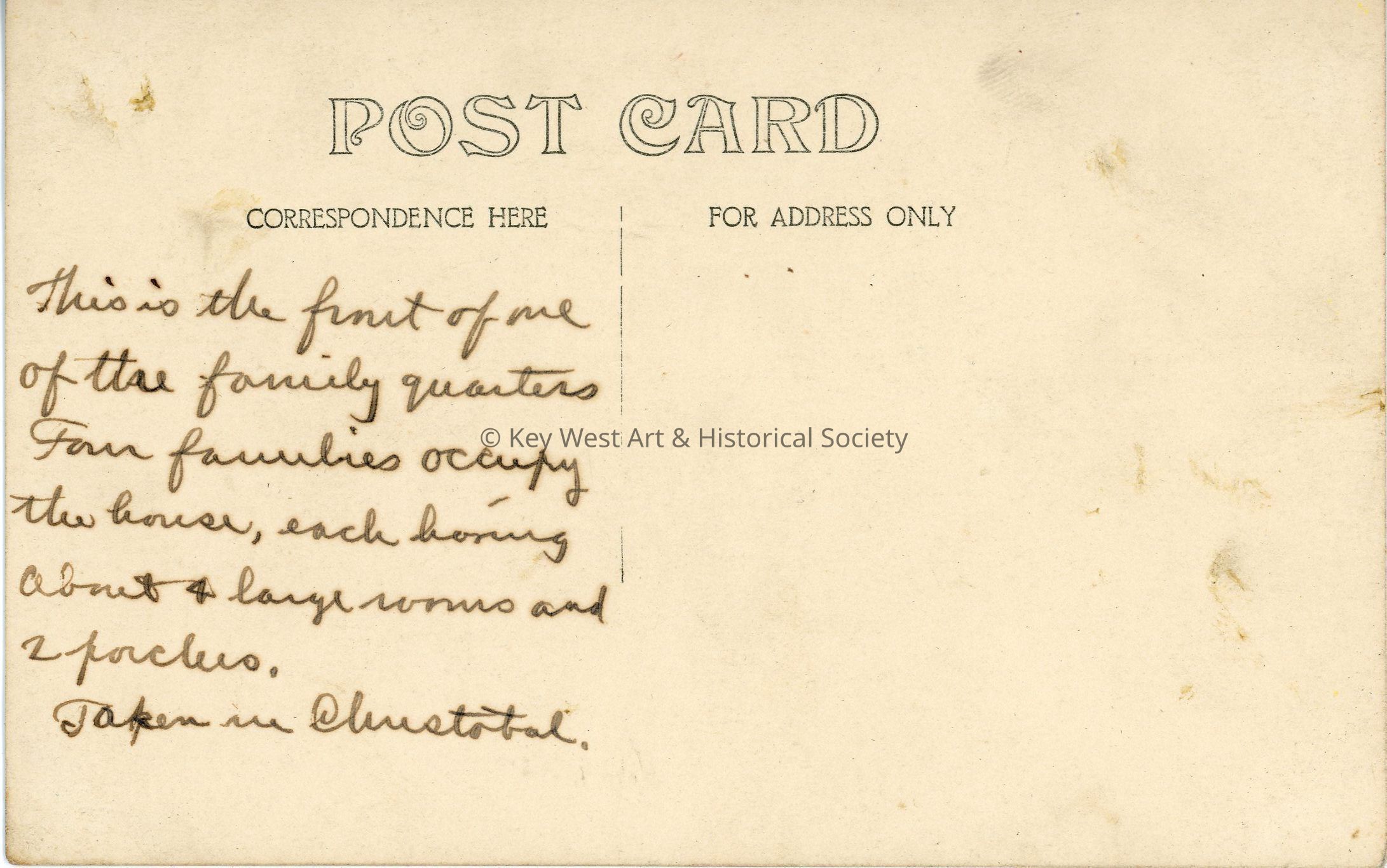 Black and white photograph postcard depicting one of the family quarters in Cristobal. Heavy vegetation surrounds the house. Verso has a handwritten note.Subject