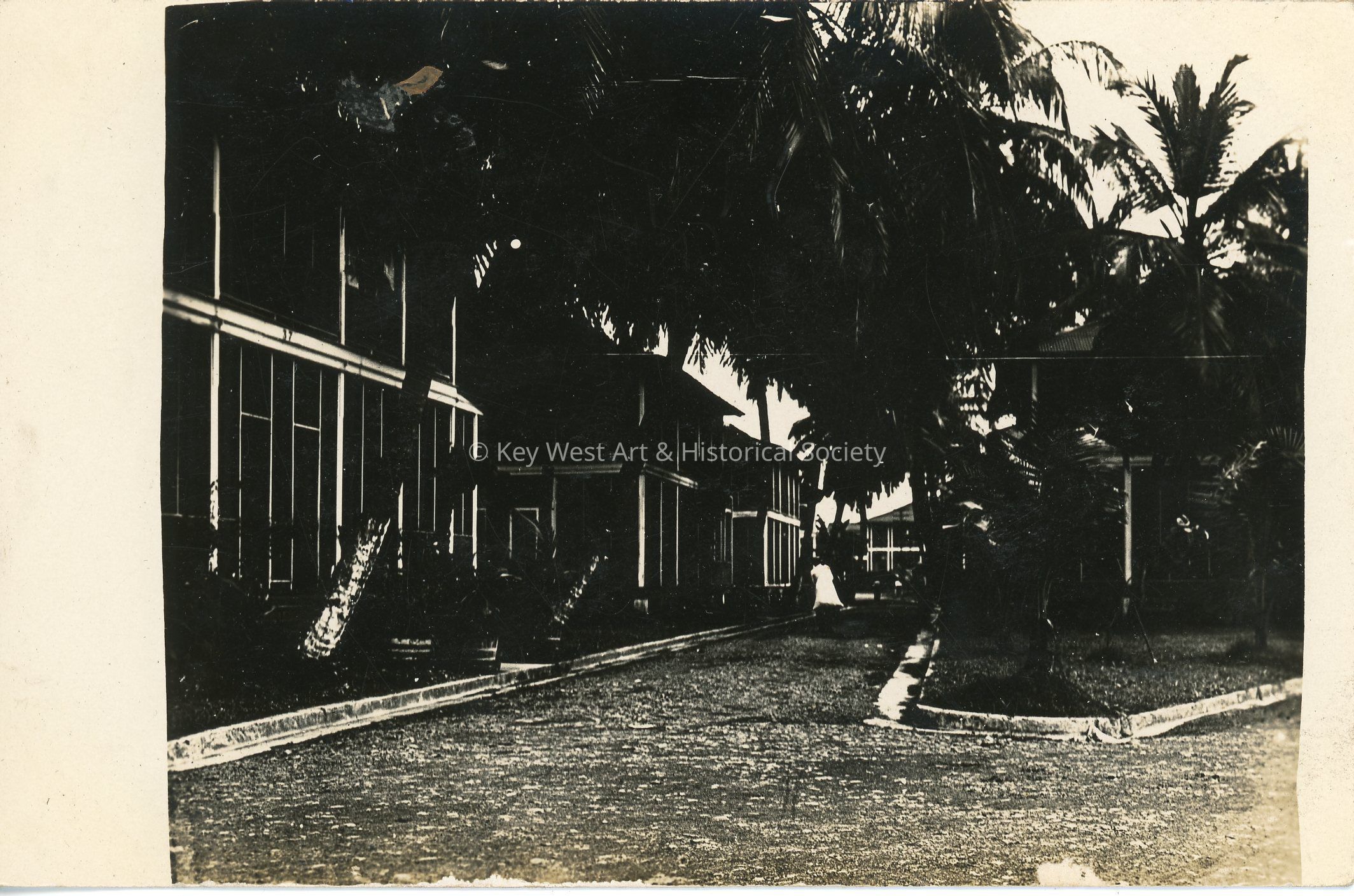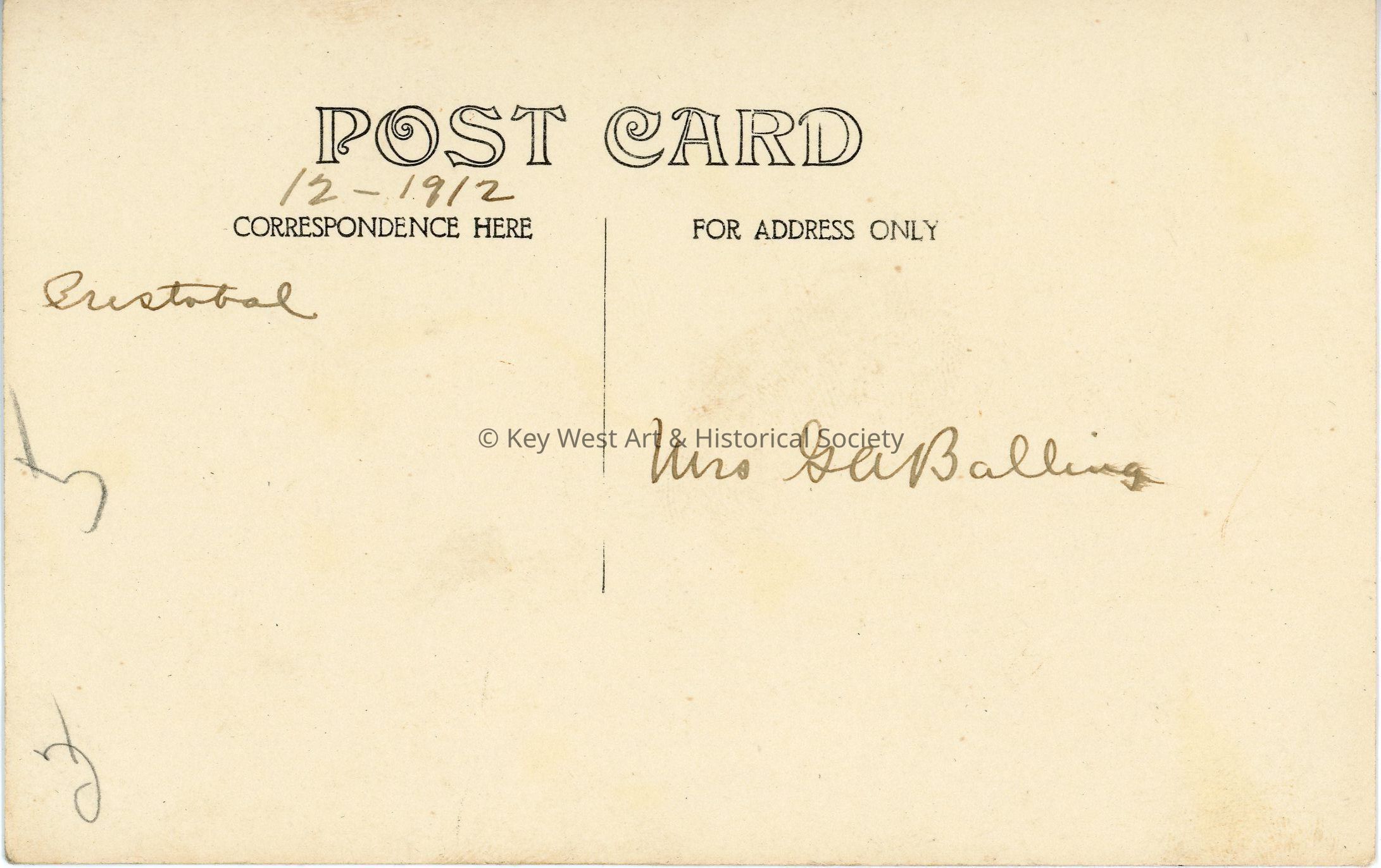 Black and white photograph postcard depicting quarters and palm trees in Cristobal, Panama. Postcard is dated December 1912 and is addressed to Mrs. G.A. Balling. Verso has a handwritten note.Subject