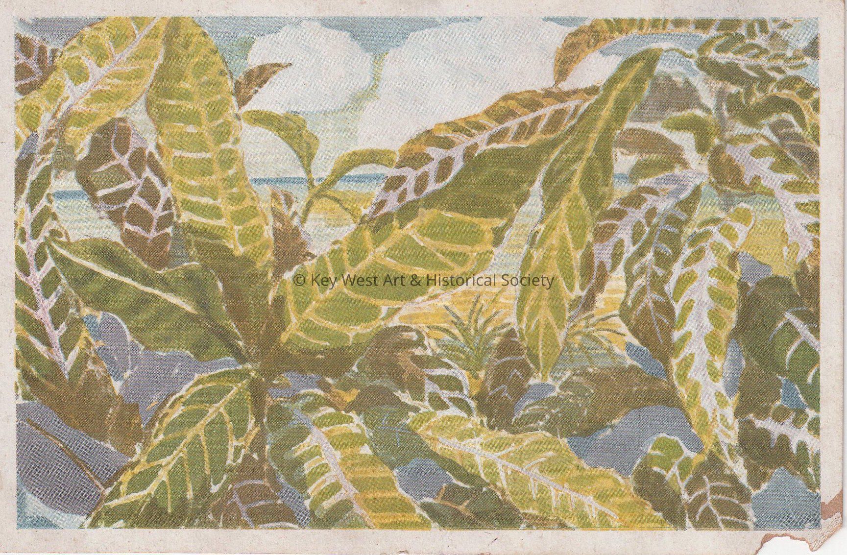 Postcard depicting a painting of leaves. The caption reads, ‘Crotons, Key West, Florida.’Collection