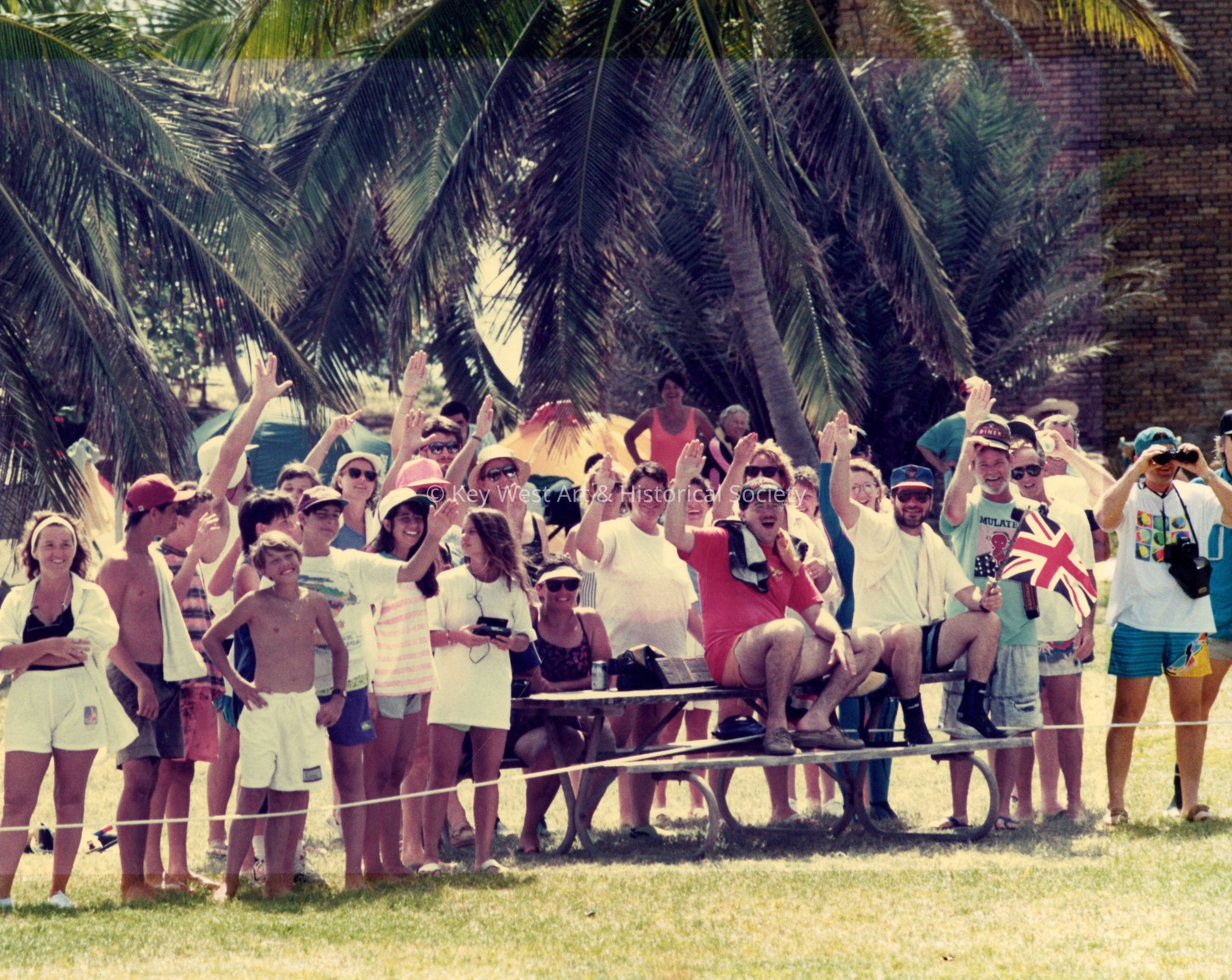 Color photograph of a crowd awaiting the arrival of Queen Elizabeth II and Prince Philip, the Duke of Edinburgh, to Fort Jefferson in Dry Tortugas National Park for a tour on May 8, 1991.Photograph Details