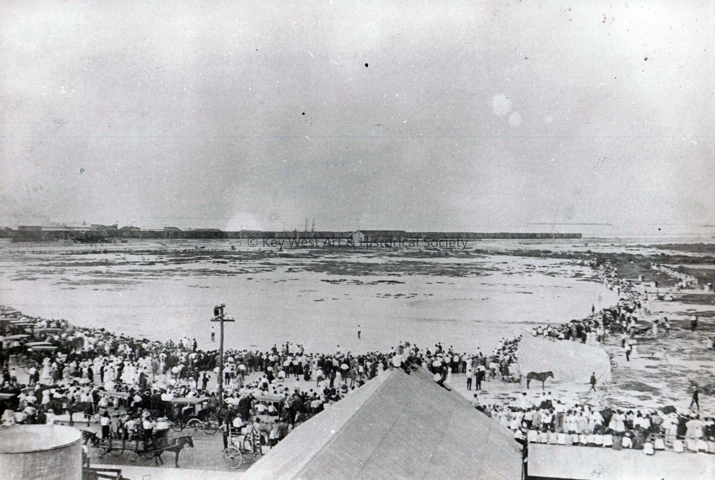 Black and white photograph of the crowd at Trumbo Field after Domingo Rosillo had taken off on the first flight between Key West and Cuba on May 17, 1913. Rosillo's airplane is a dot in the sky.