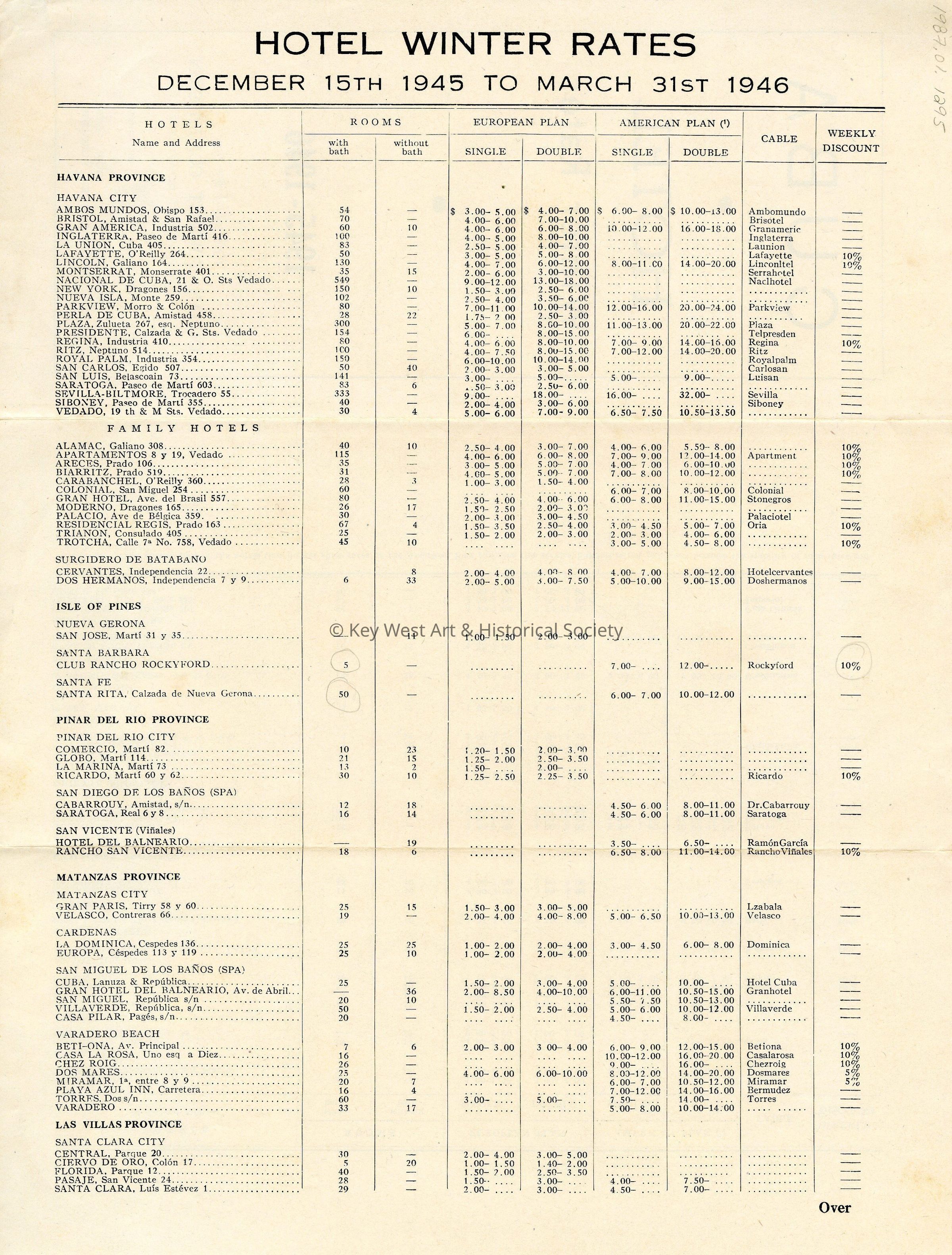 Cuba Hotel Winter Rates brochure published by the Cuban Tourism Commission for the winter 1945 to 1946.Collection
