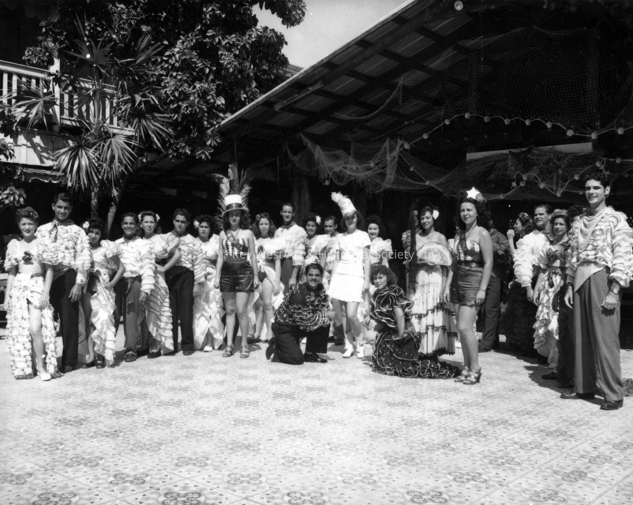 Black and white photograph of Cuban comparsa on the open air dance floor at the Habana Madrid nightclub, formerly located at 425 Front Street.