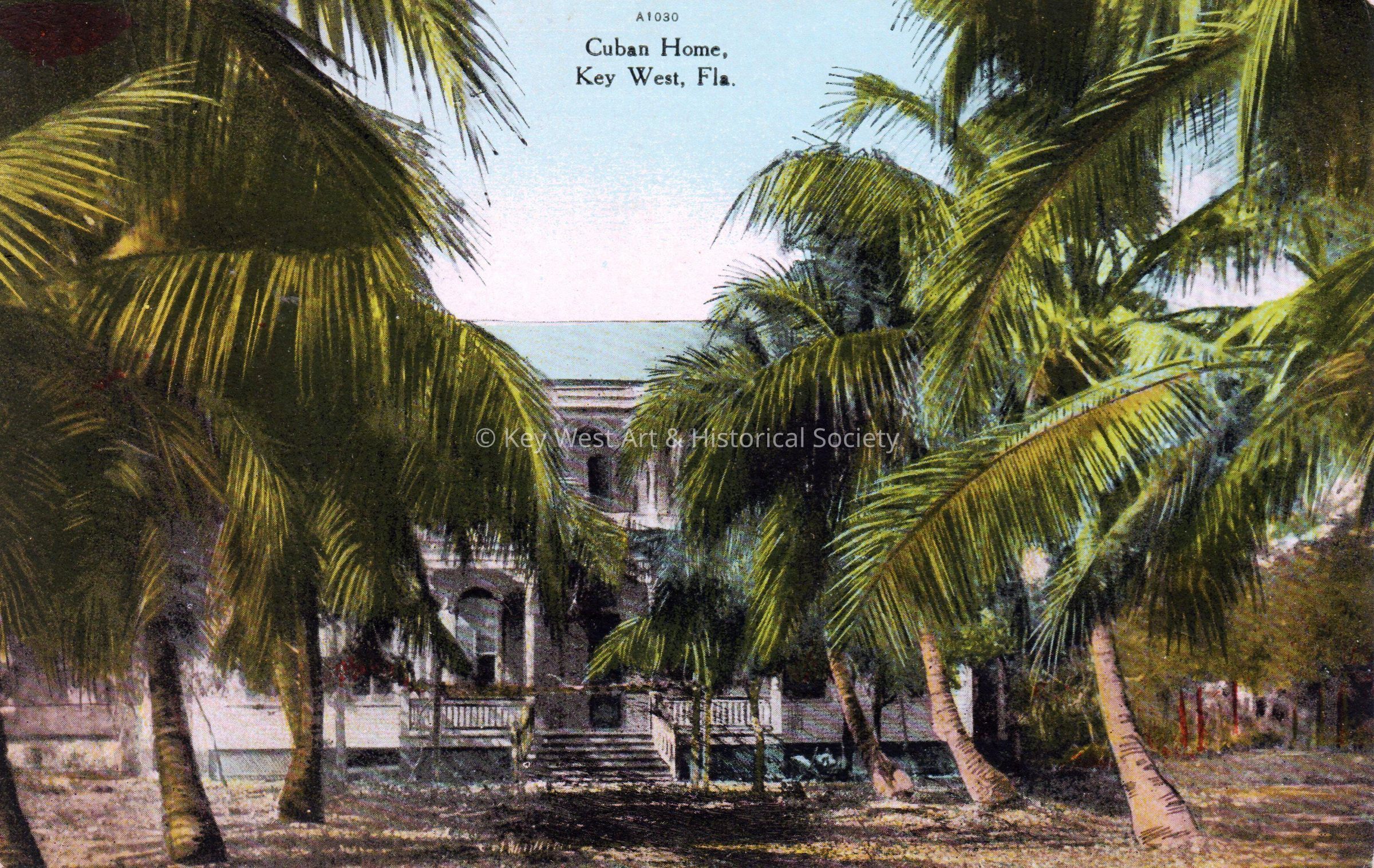 Postcard depicting a two-story home behind palm trees. The caption reads, ‘Cuban home, Key West, Florida’.Subject Place