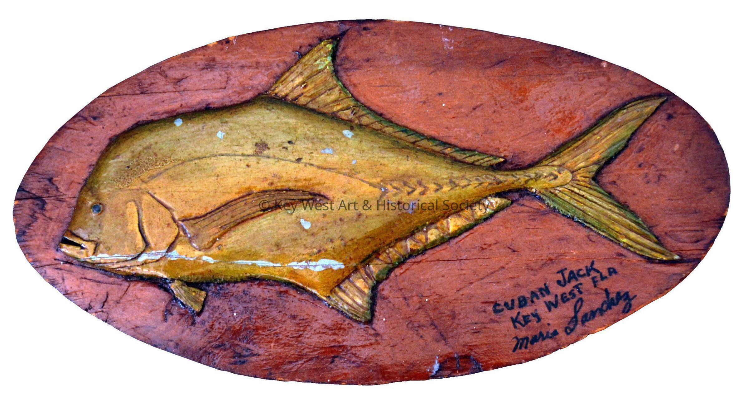 Wood carving by Mario Sanchez depicting a Cuban jack fish.Type of Sculpture
