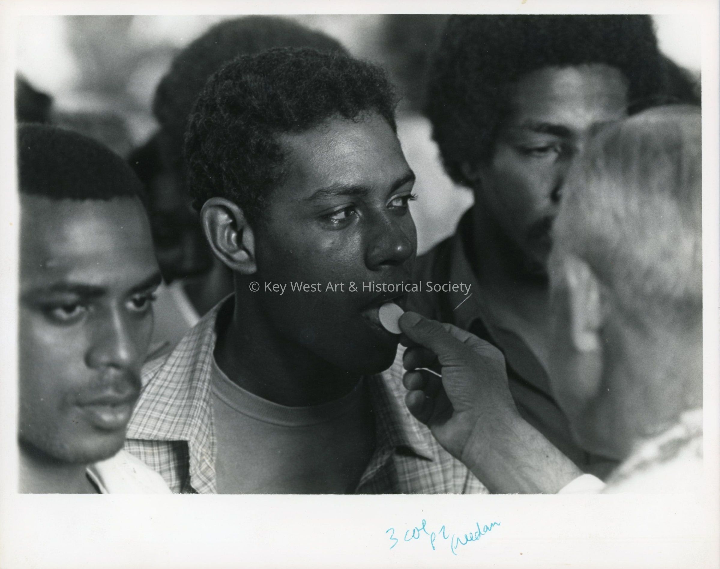 Black and white photograph of a young Cuban migrant receiving the Eucharist from a priest during the Mariel Boatlift.
