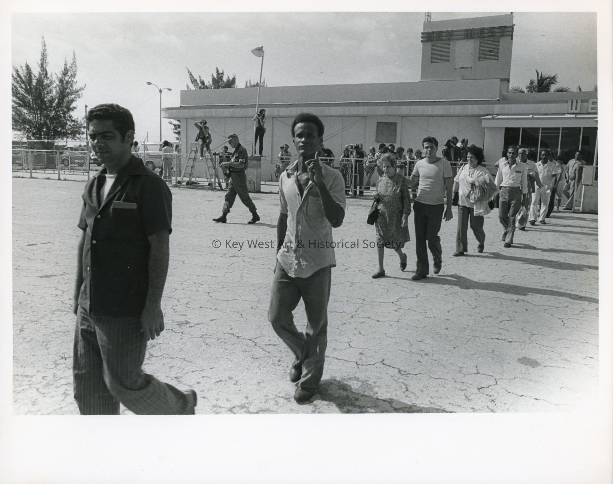 Black and white photograph of a Cuban refugees walking onto the tarmac to a plane en route to Eglin Air Force Base to be processed into the United States.