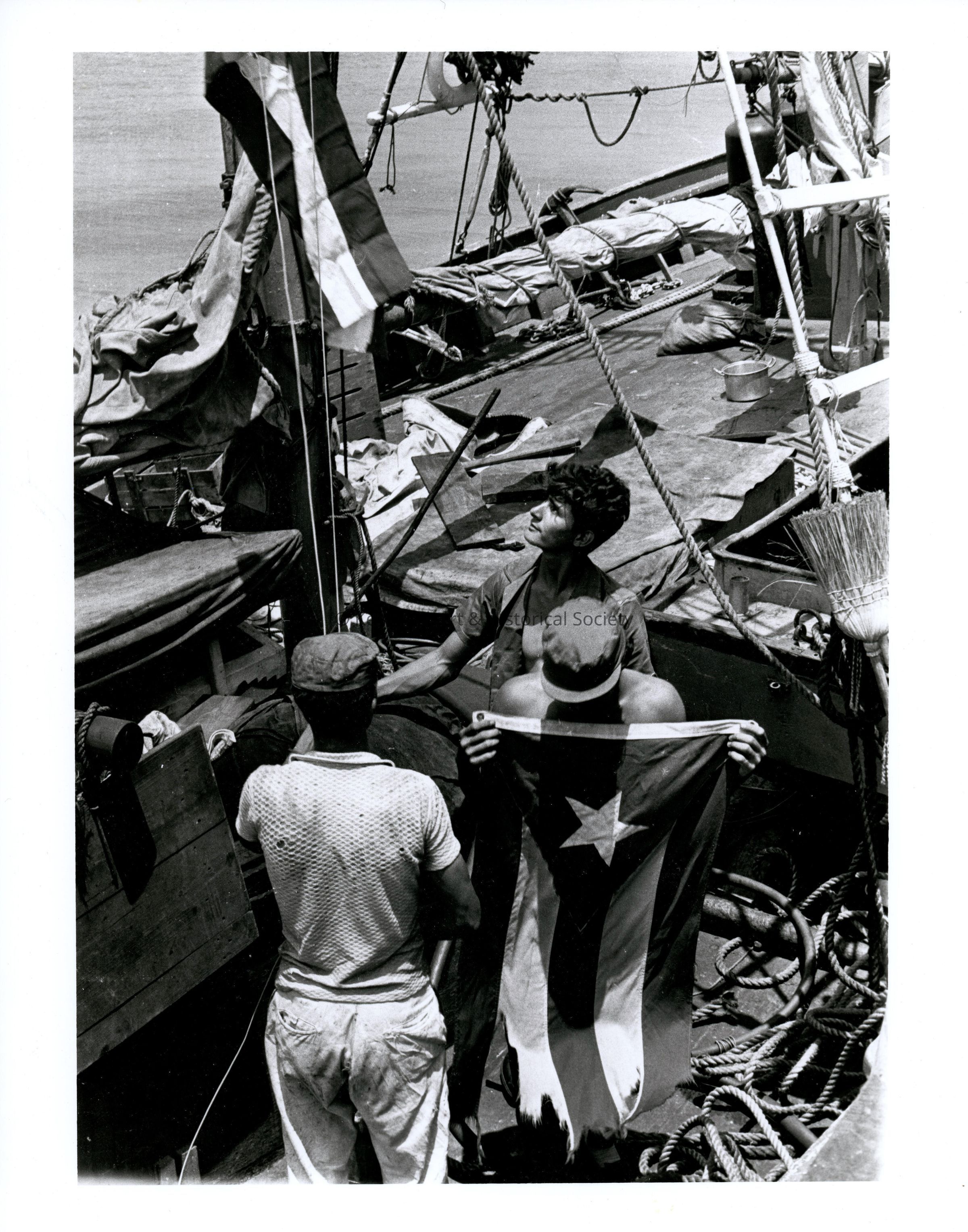 Black and white photograph of Cuban sailors onboard the ship MARTIN GUTIERREZ out of Batabano, Cuba.