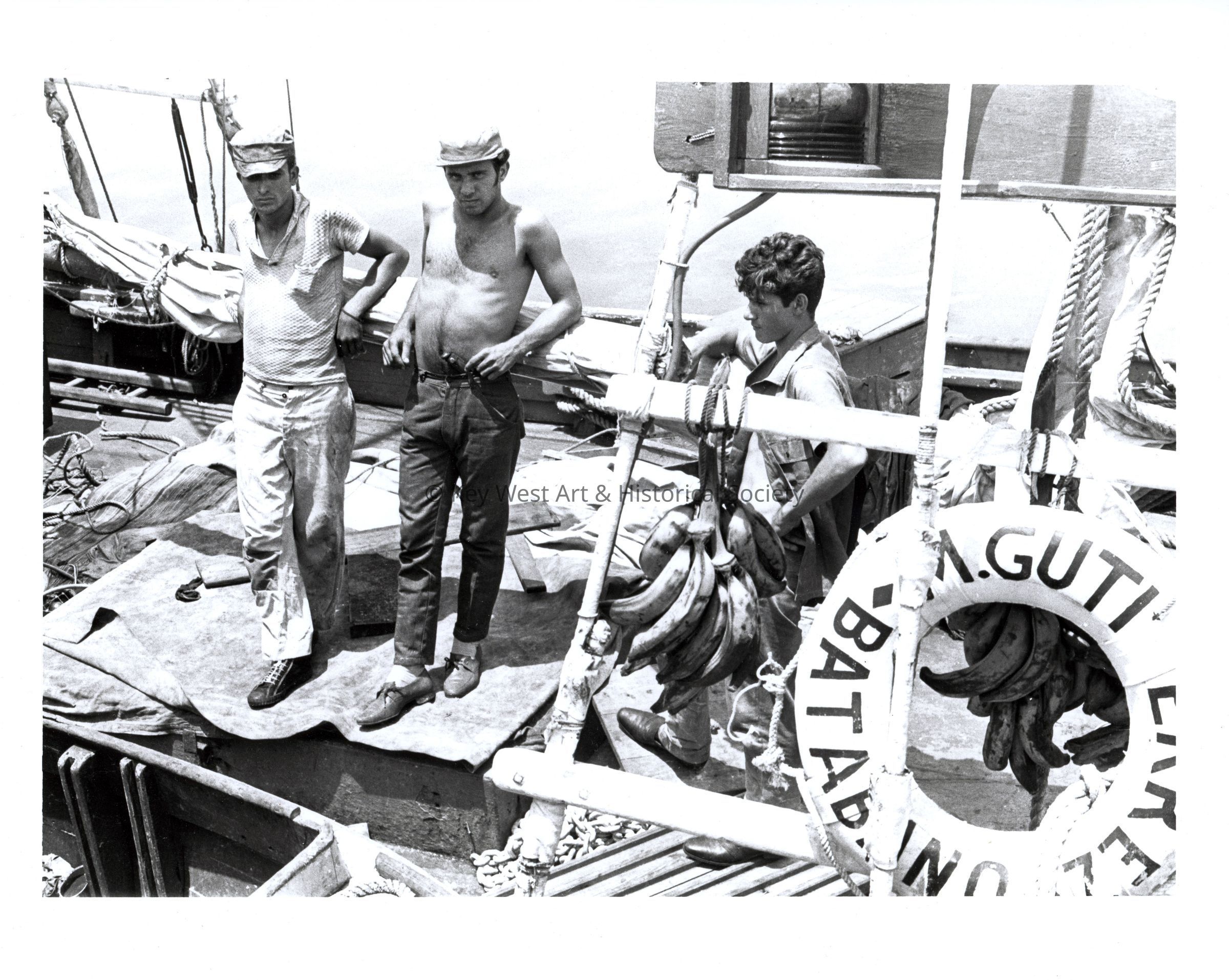 Black and white photograph of Cuban sailors onboard the ship MARTIN GUTIERREZ out of Batabano, Cuba.