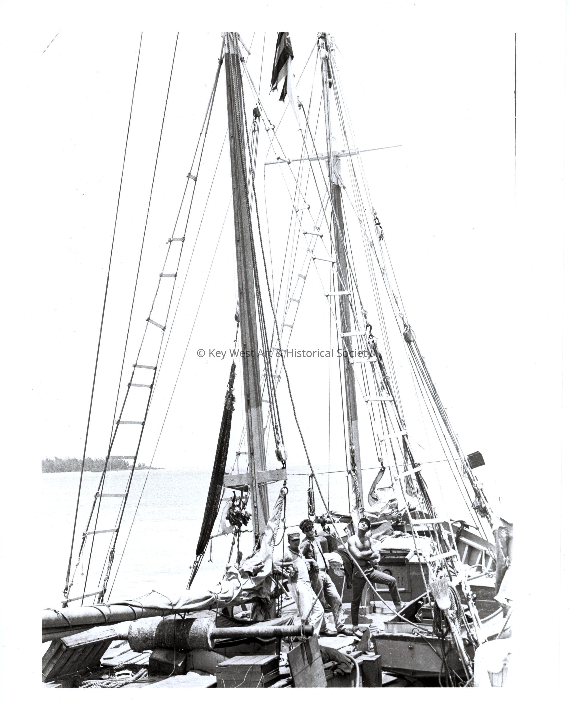 Black and white photograph of Cuban sailors onboard the ship MARTIN GUTIERREZ out of Batabano, Cuba.