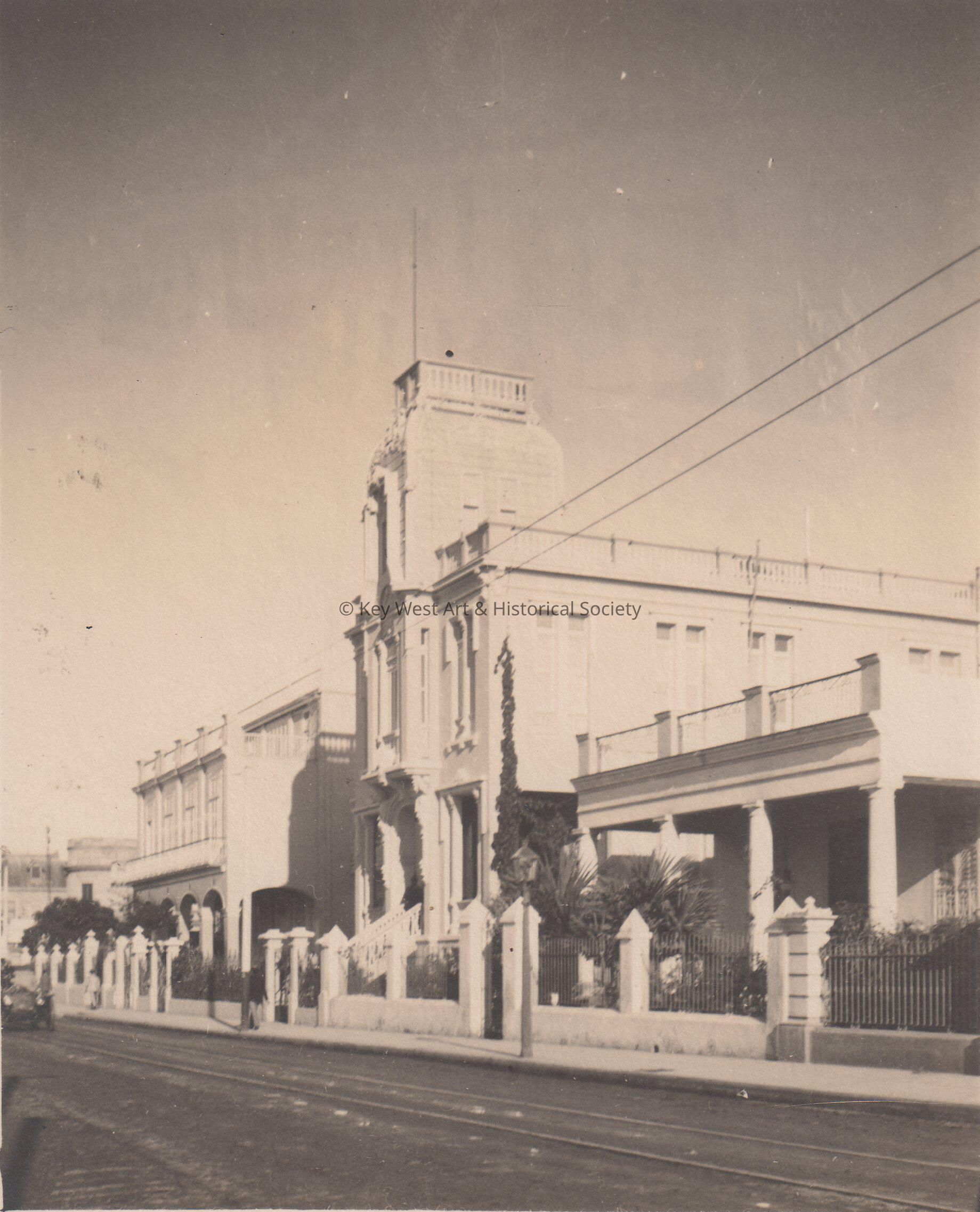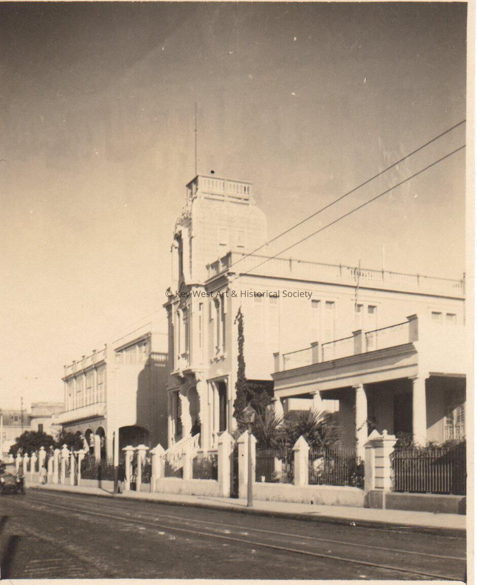 Black and white photo taken in Cuba, Image is taken from the street and shows a large, white two story building.Collection