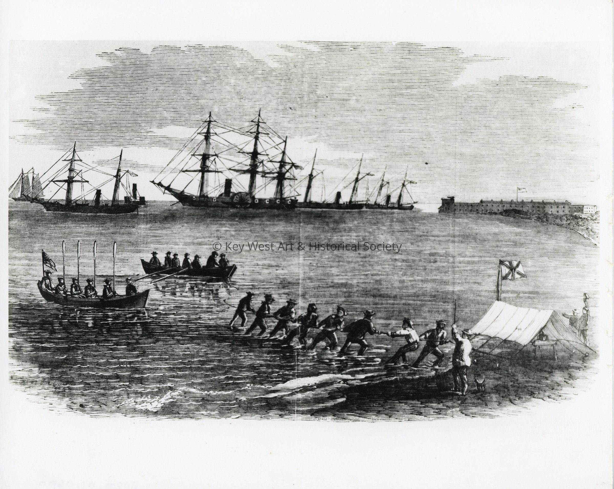 Black and white drawing of the Cuban Telegraph Cable landing near Fort Zachary Taylor. Sketched by Dr. J.B. Holder and published in Harper's Weekly of September 7, 1867.