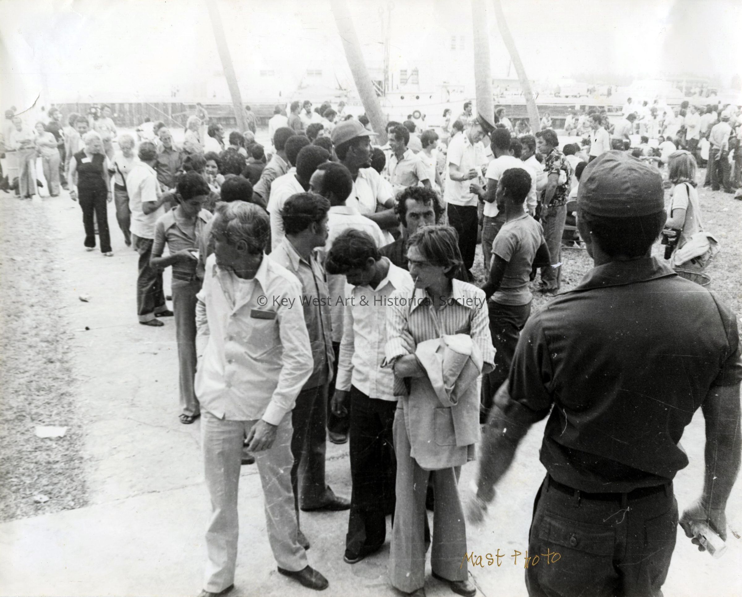 Black and white photograph of a group of Cuban people lining up for lunch on Truman Waterfront during the Mariel Boatlift.