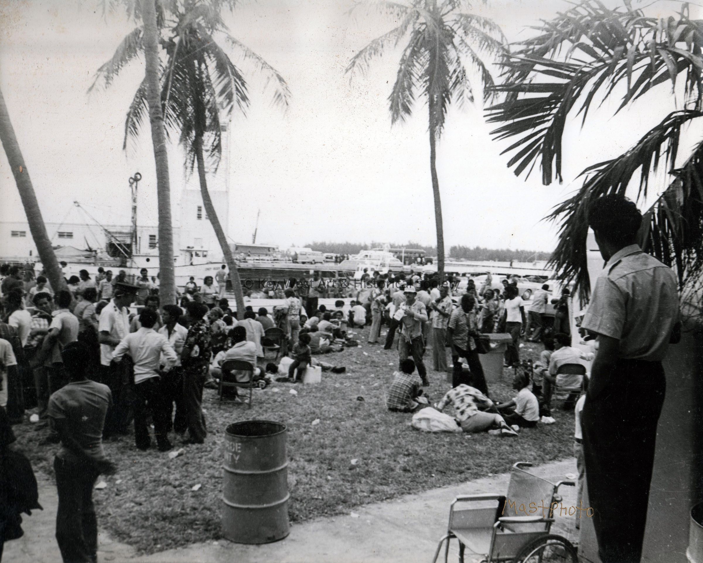 Black and white photograph of Cubans on Truman Waterfront recently arrived during the Mariel Boatlift.Photograph Details