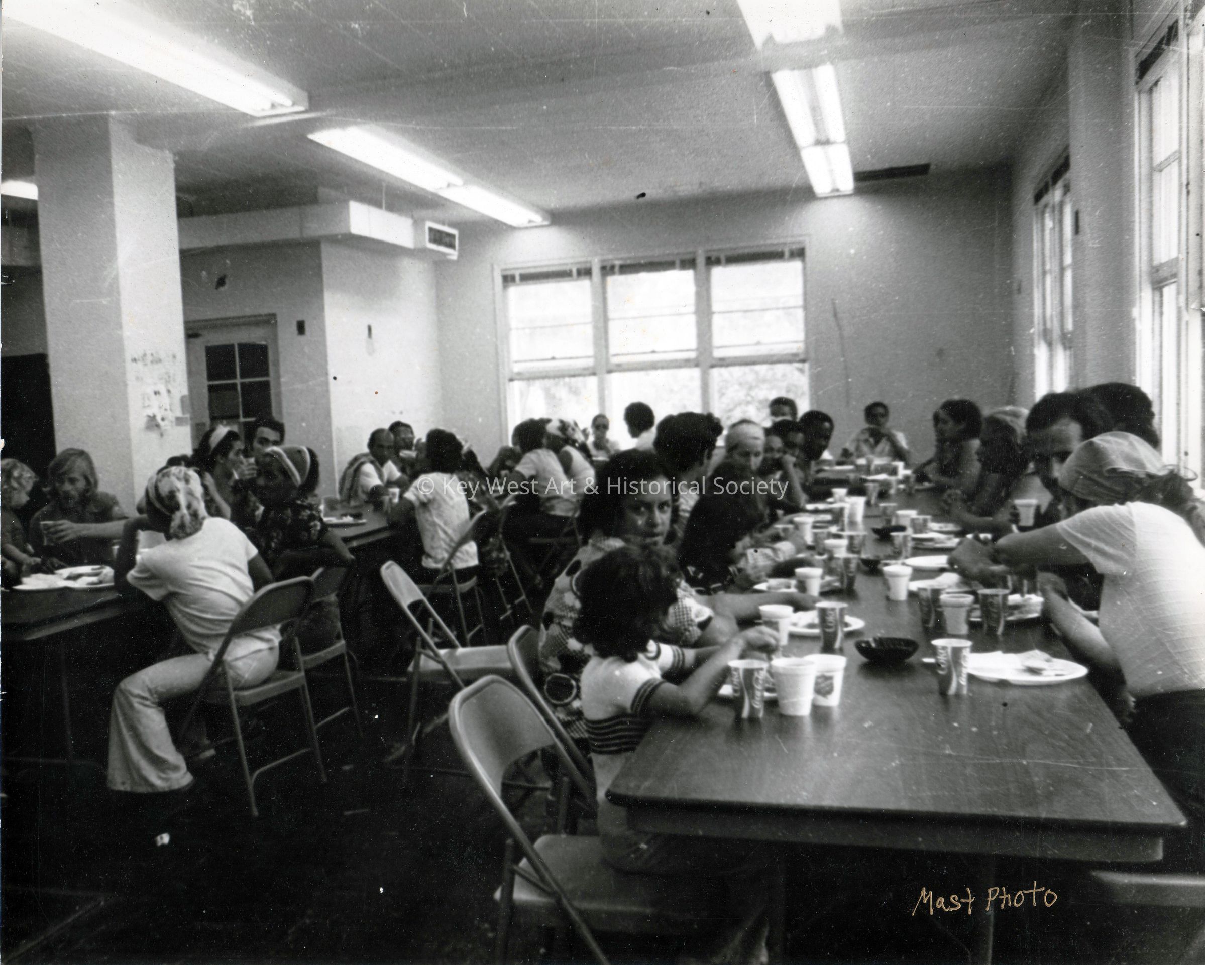Black and white photograph of Cubans on Truman Waterfront recently arrived during the Mariel Boatlift