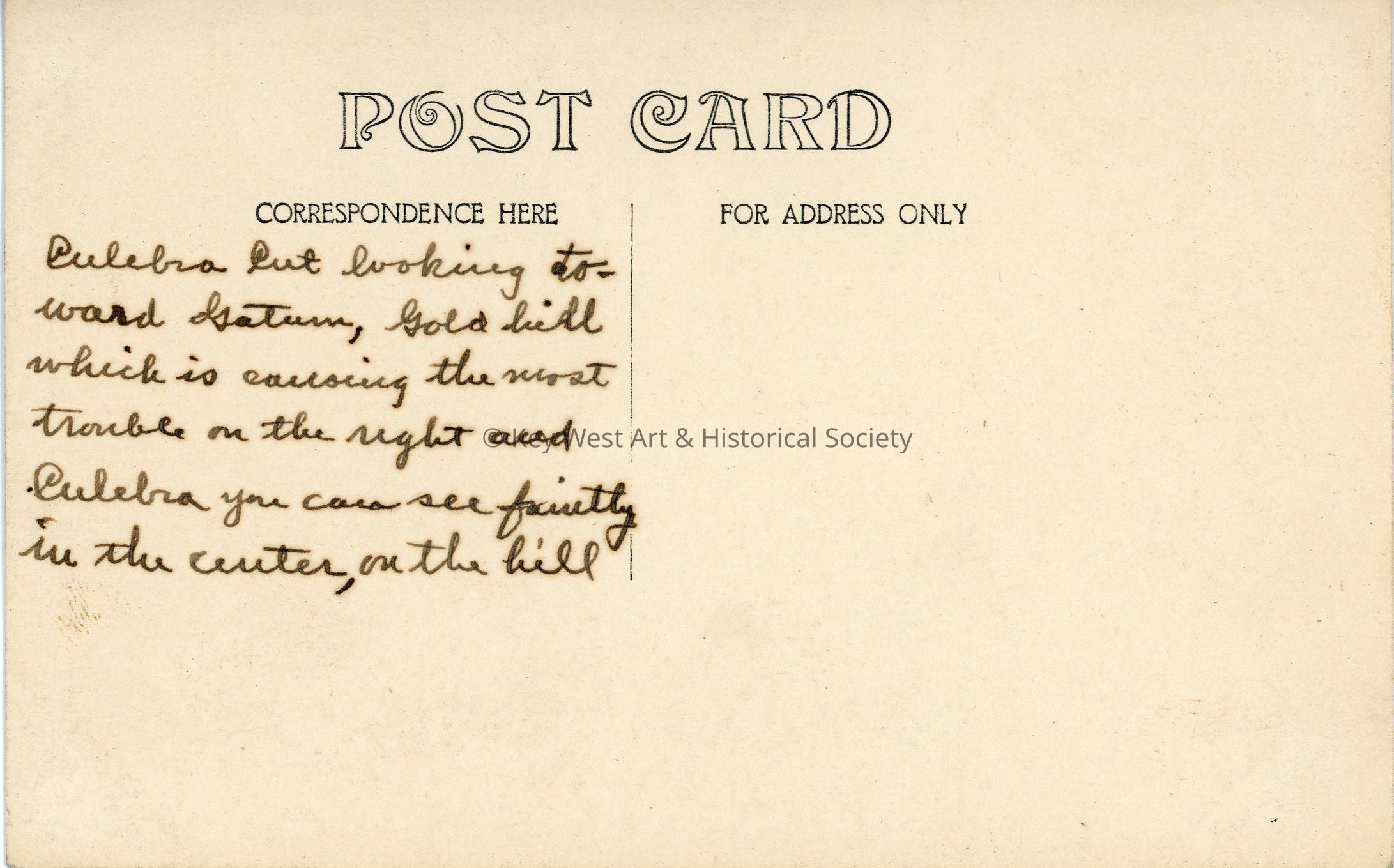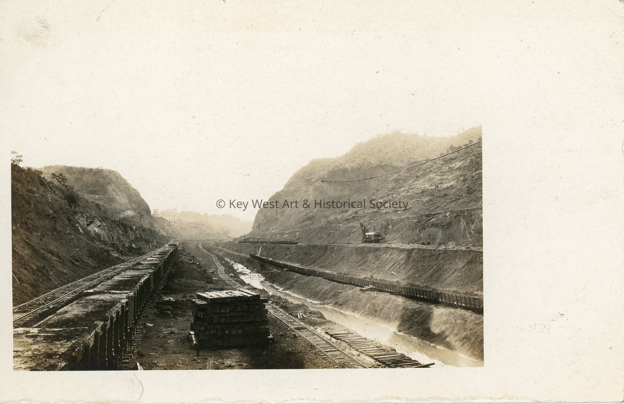Black and white photograph postcard depicting the construction of the Panama Canal at the Culebra Cut, also known as the Gaillard Cut. The photo shows Gold Hill on the right side of the gorge. In the distance a community can be seen.Subject