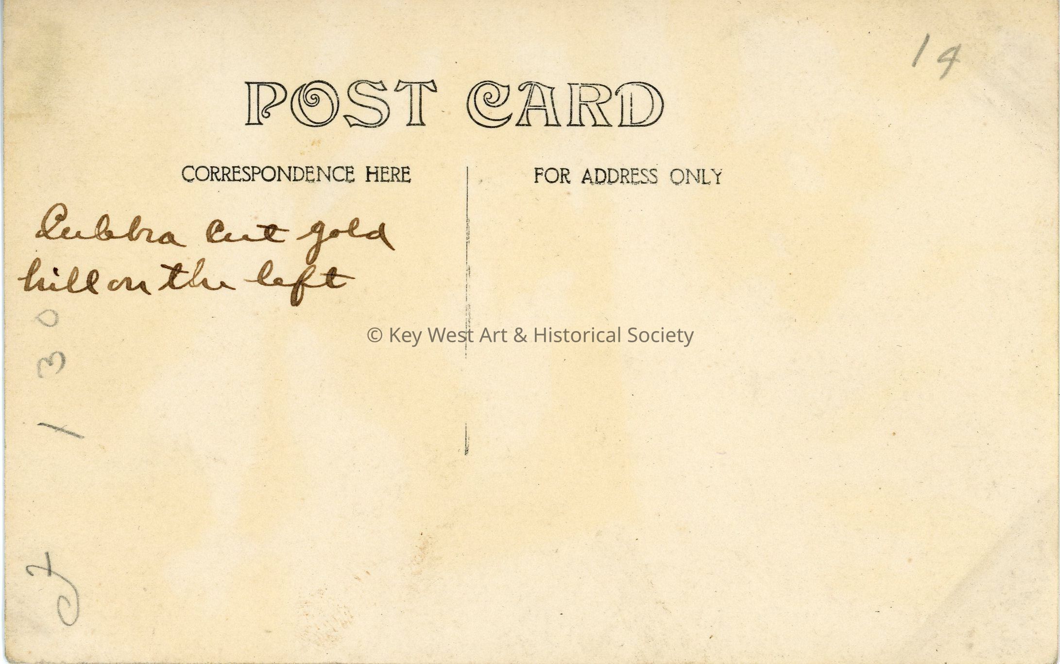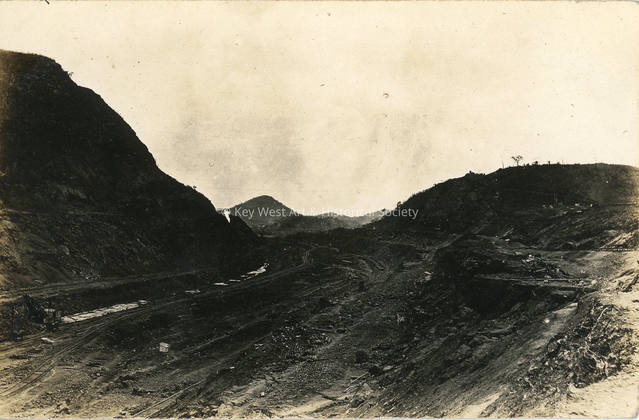 Black and white photograph postcard depicting the construction of the Panama Canal at the Culebra Cut, also known as the Gaillard Cut. The photo shows railroad tracks going through the center of the created valley with Gold Hill on the left. Verso has handwritten note.Subject