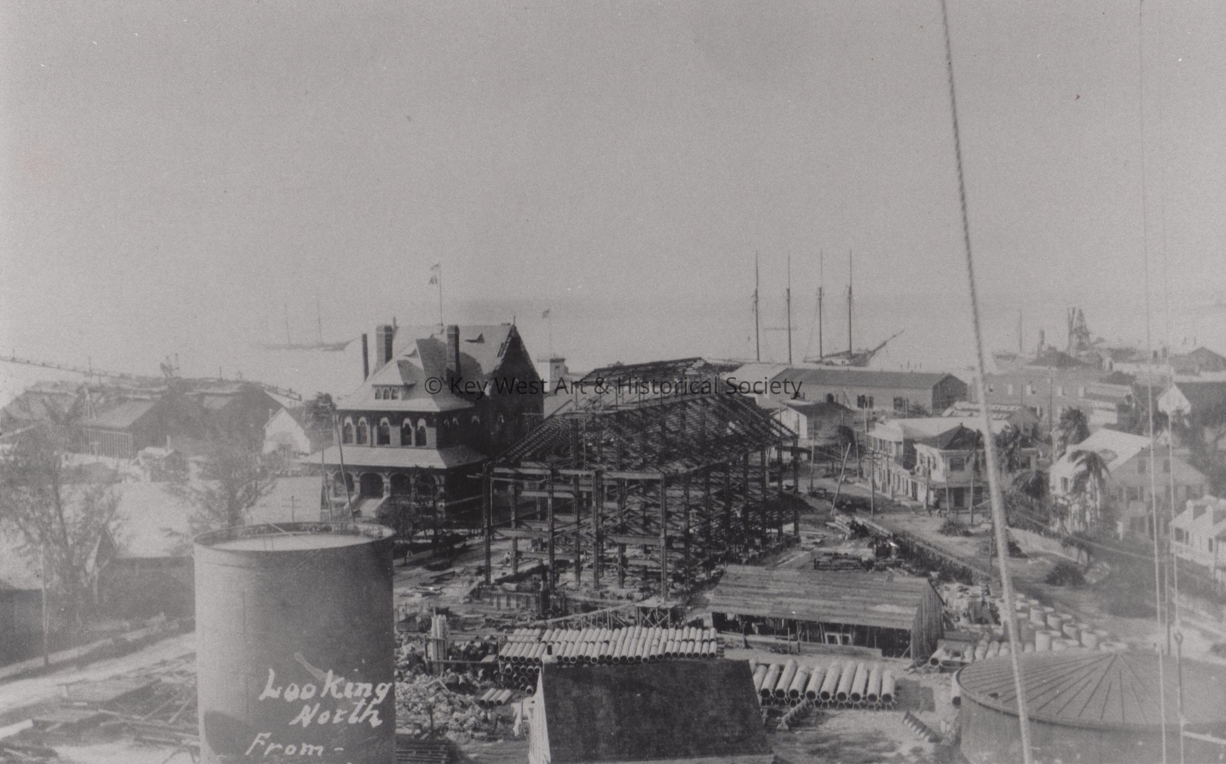 Black and white photograph of the Key West Custom House looking north from Naval Station Key West. The present-day Mel Fisher Maritime Museum building is under construction.