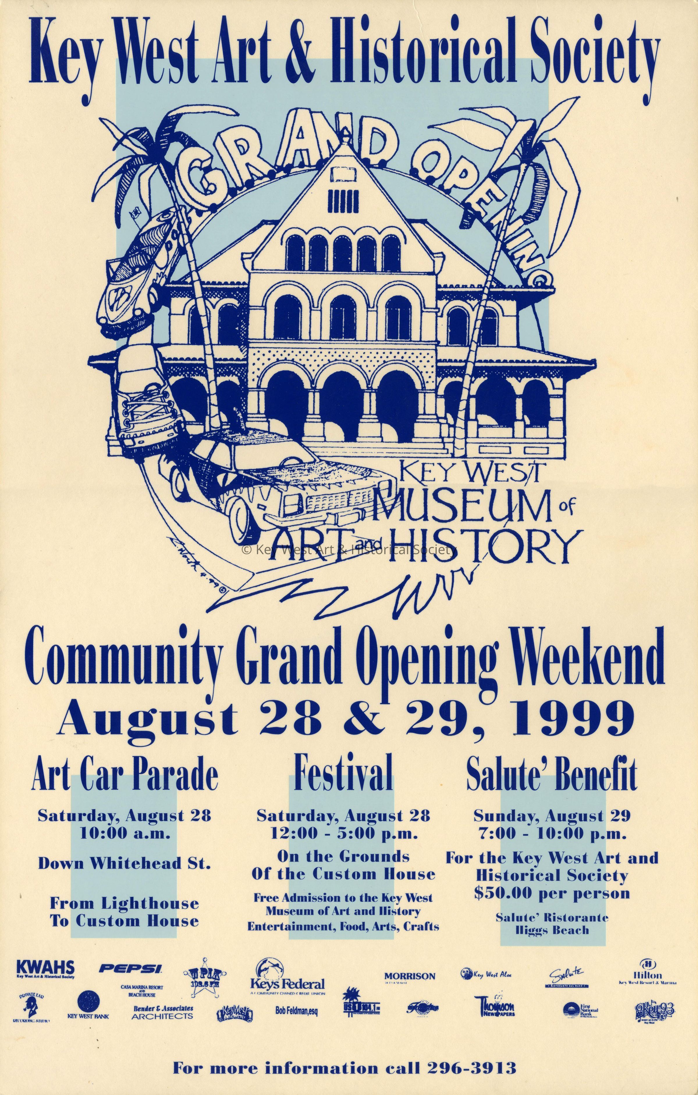 A poster celebrating the Grand Opening of the renovated Custom House Museum operated by the Key West Art & Historical Society. The grand opening was scheduled for August 28 and August 29, 1999. Events included an Art Car Parade down Whitehead Street, a Festival on the grounds of the Custom House and a Benefit at Salute Restaurant.Collection