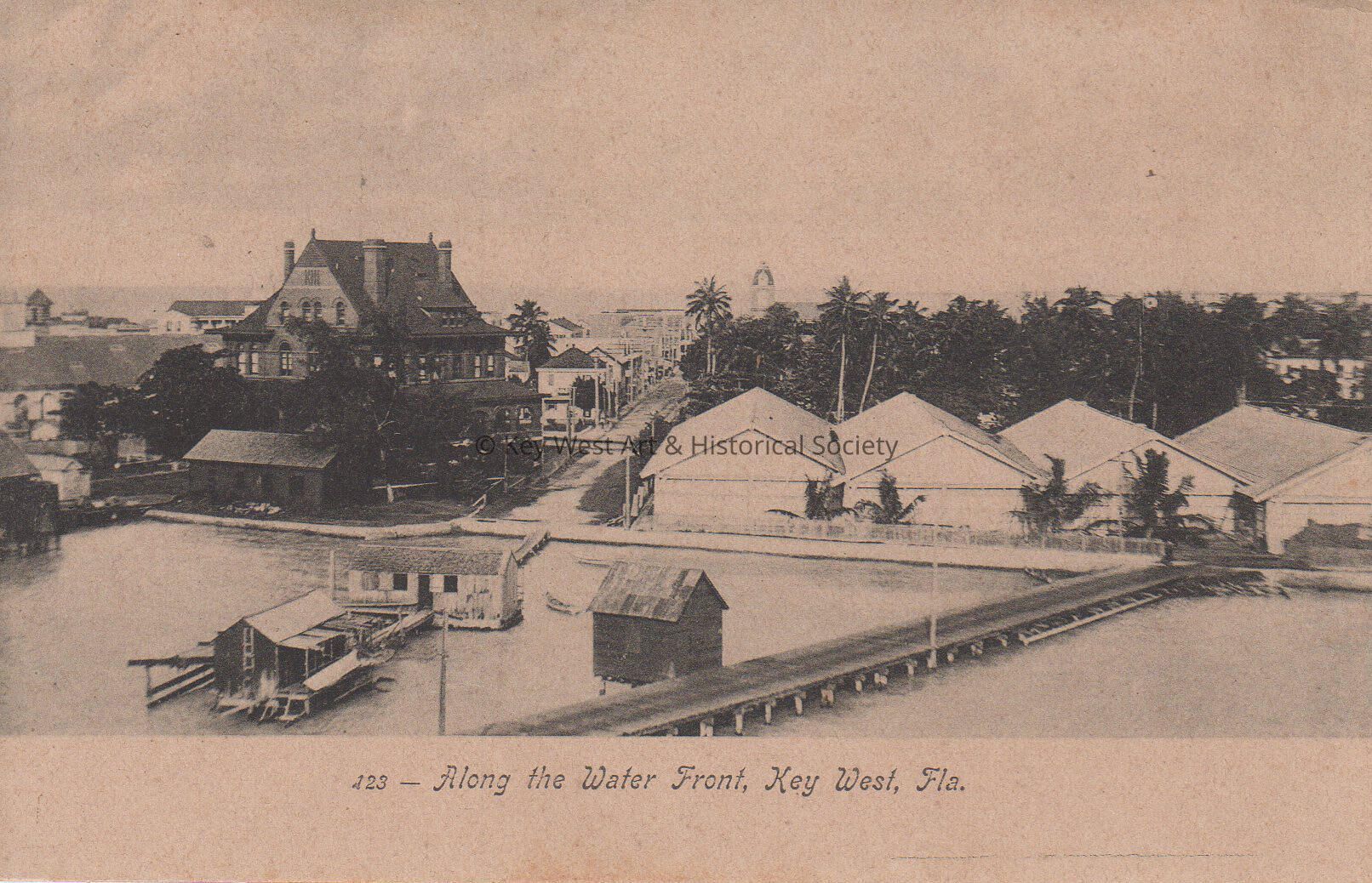 Postcard depicting the Custom House and other buildings near a beach. The caption reads, 'Along the water front, Key West, Florida'.Subject Place