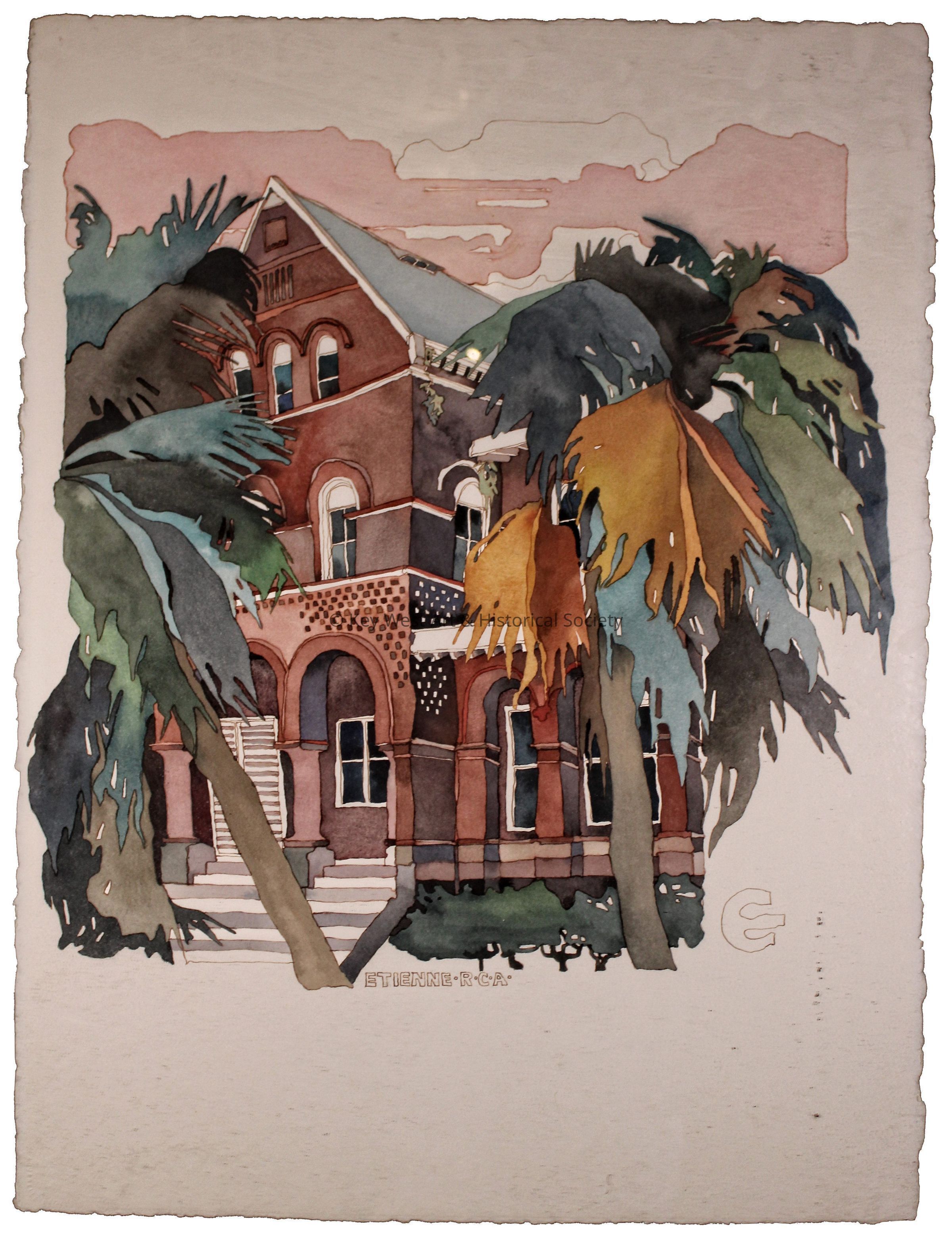Watercolor on paper by Errol Etienne depicting the front facade of the Key West Custom House. The watercolor was created to promote the restoration of the building in the 1990s.Artwork Details