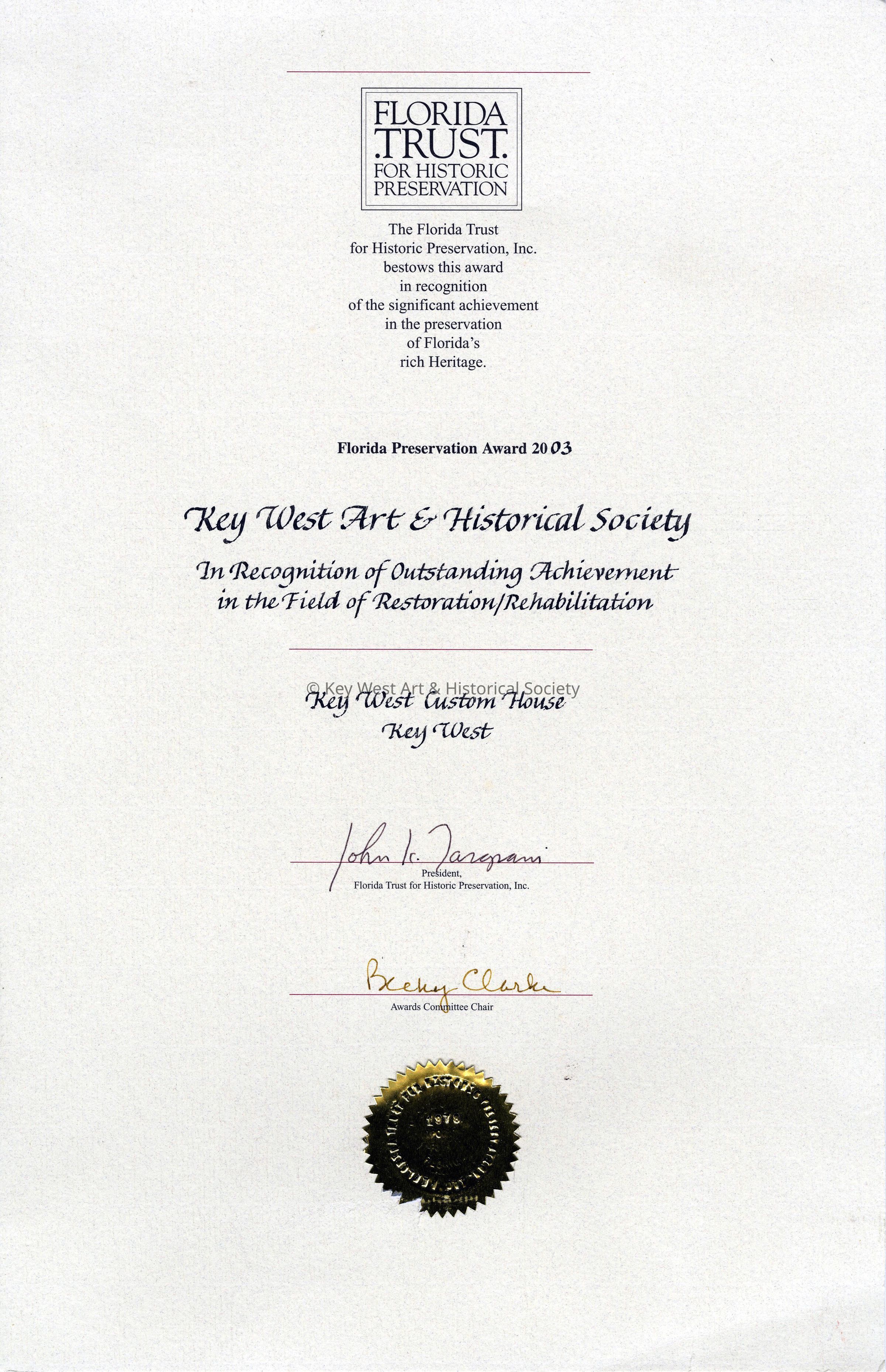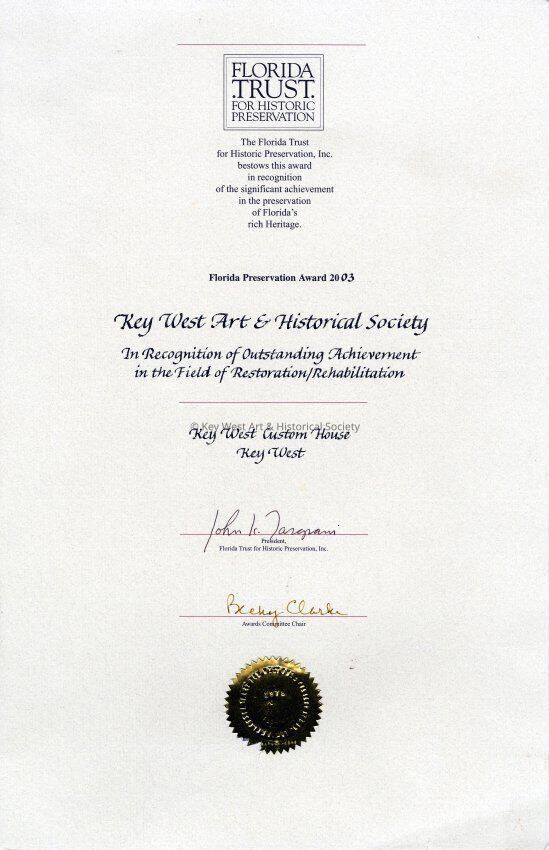 Custom House Restoration Outstanding Achievement Award presented by the Florida Trust for Historic Preservation.
