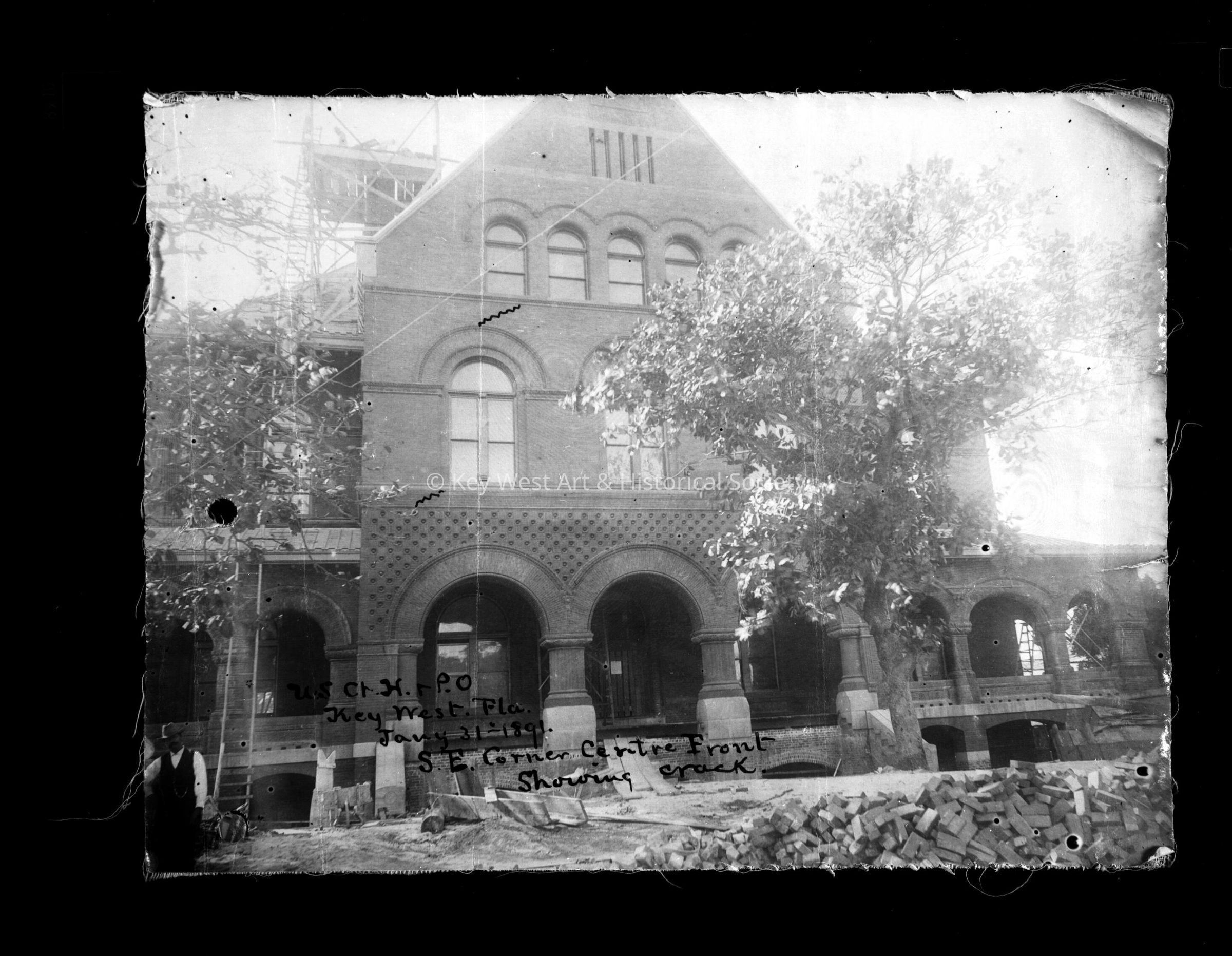 Black and white negative of the Custom House under construction taken from the southeast corner looking toward the main entrance.