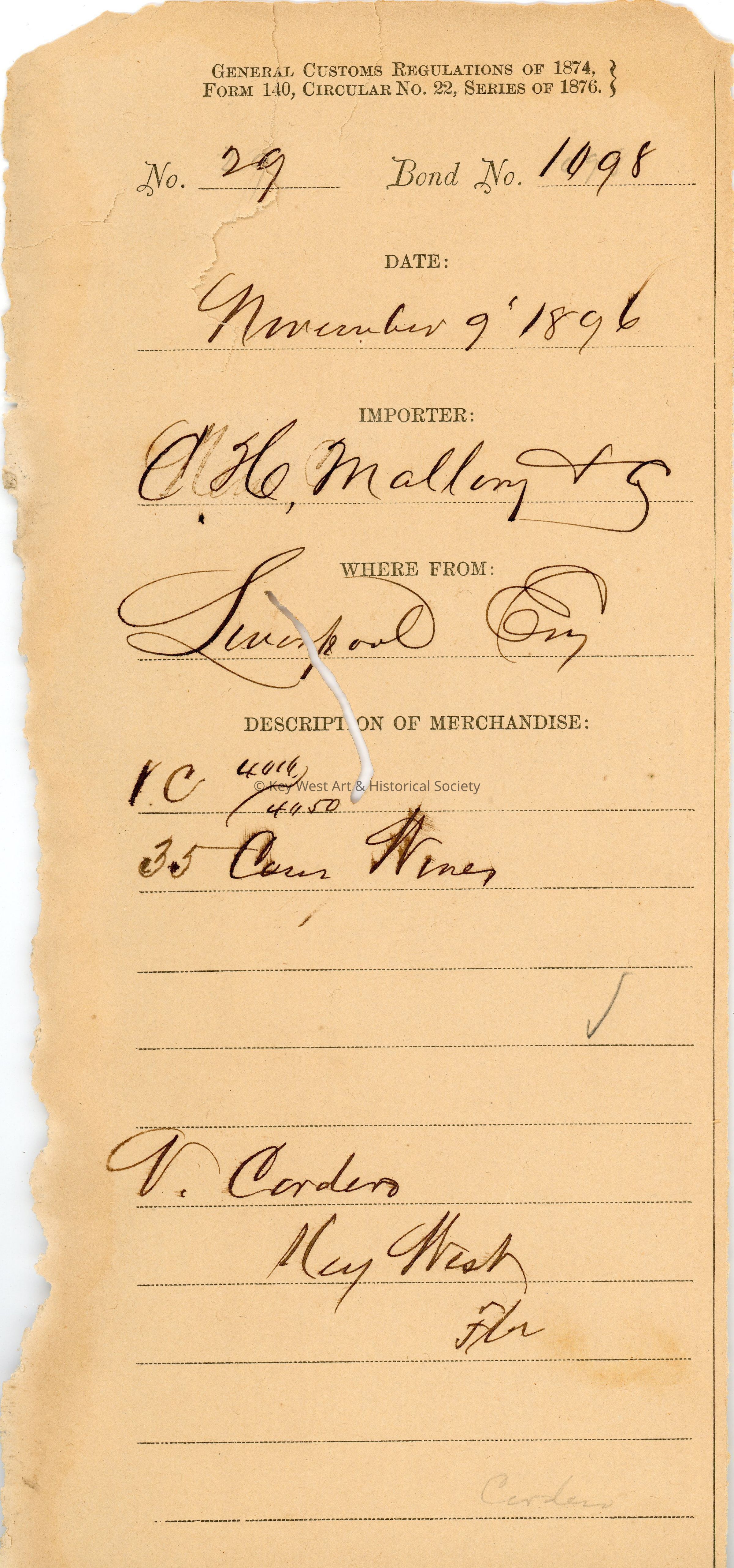 Customs receipt for the importation of thirty-five cases of wine from Liverpool, England by C.H. Mallory & Co. which were consigned to V. Cordero in Key West. Dated November 9, 1896.