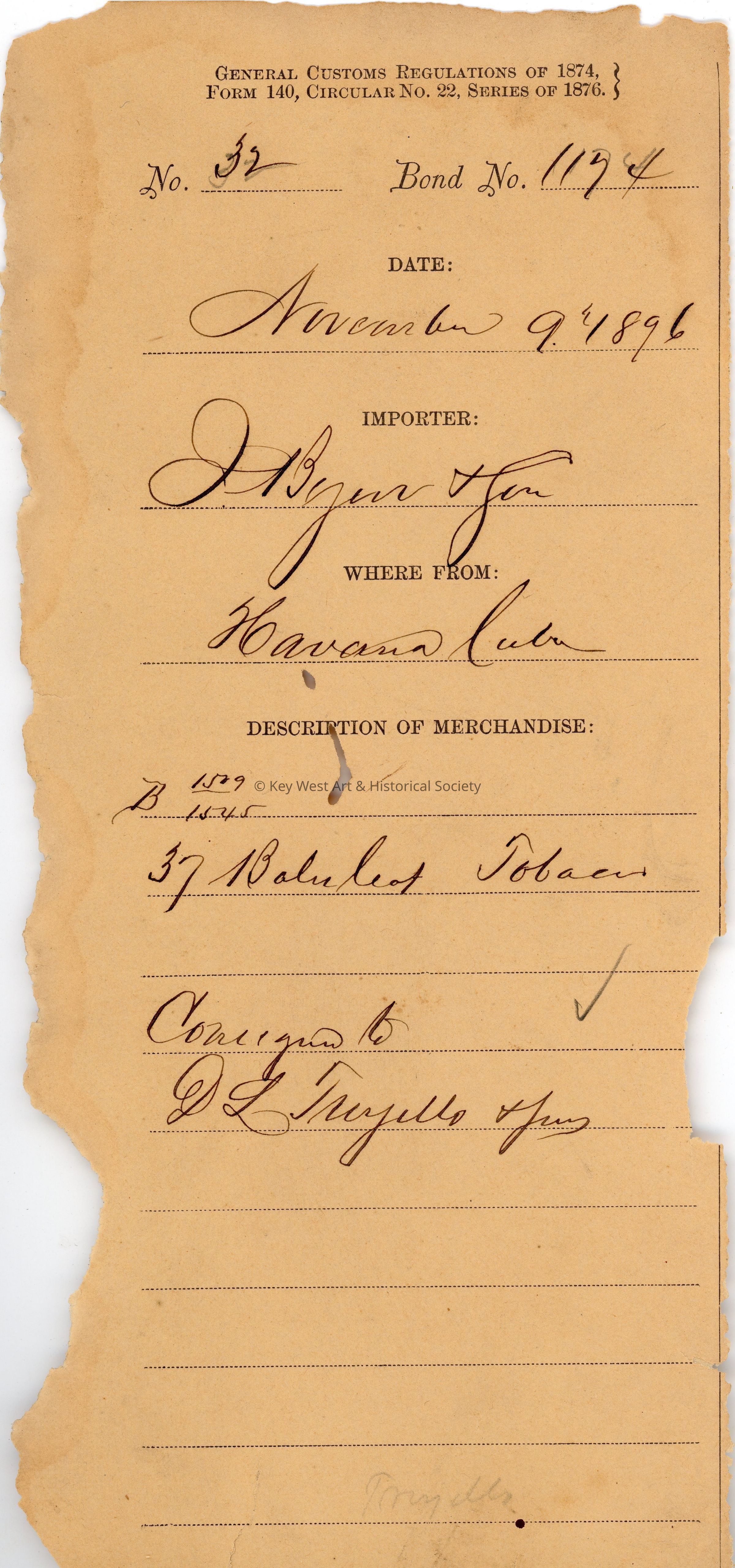 Customs receipt for the importation of thirty-seven bales of leaf tobacco from Havana, Cuba by J. Byan & Bro. which were consigned to D.L. Trujillo & Sons in Key West. Dated November 9, 1896.