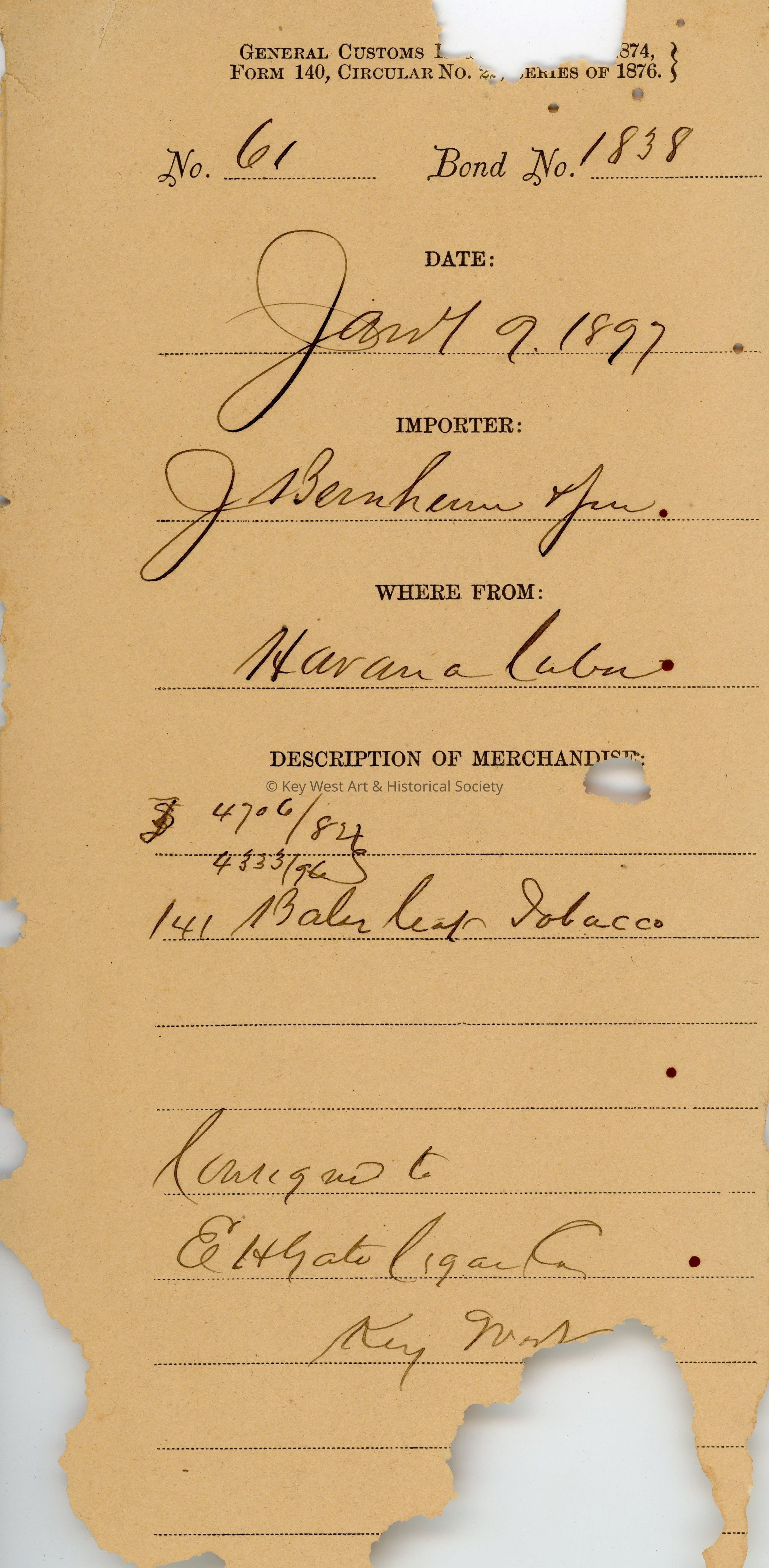 Customs receipt for the importation of one hundred and forty-one bales of leaf tobacco from Havana, Cuba by J. Bernheim & Son which were consigned to E.H. Gato Cigar Co. in Key West. Dated January 9, 1897.